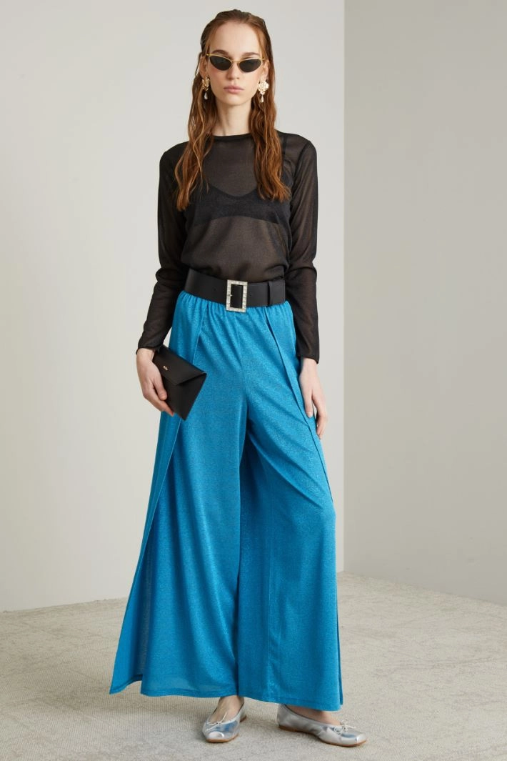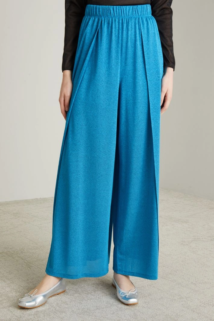 Wide-leg lurex jersey trousers with elastic waistband and slit detail.