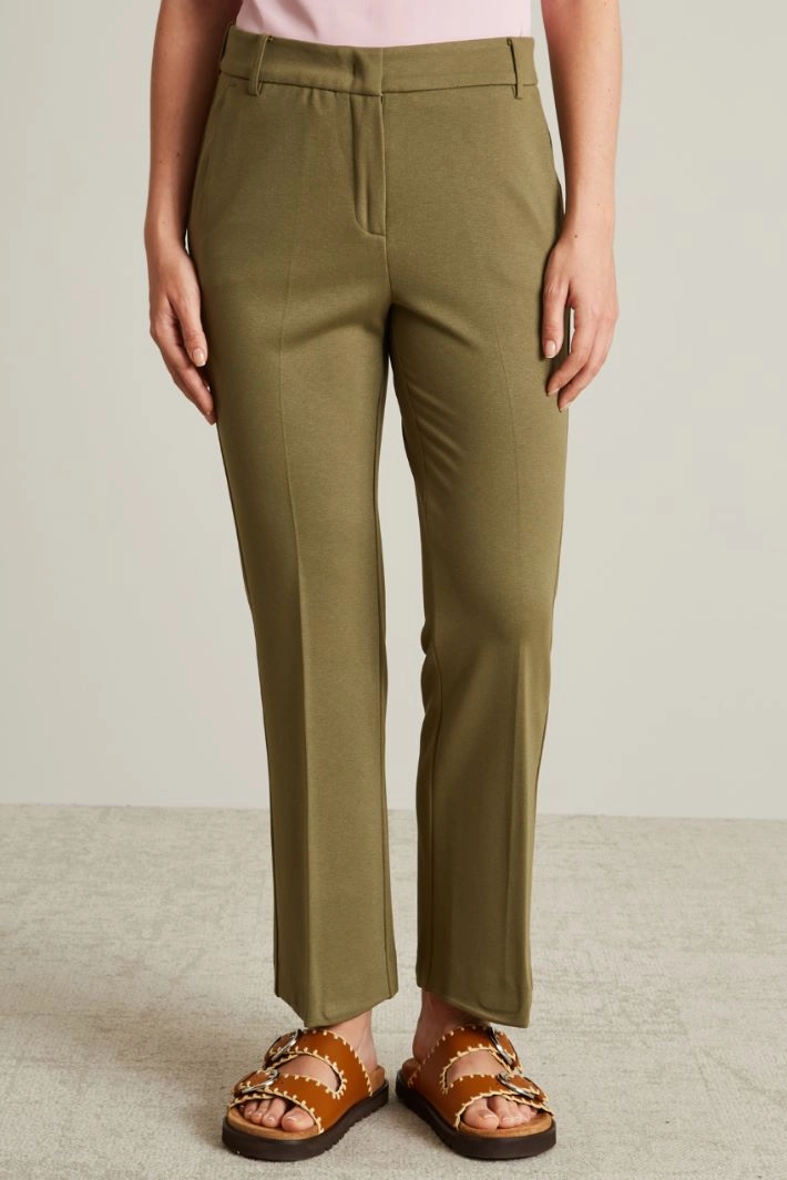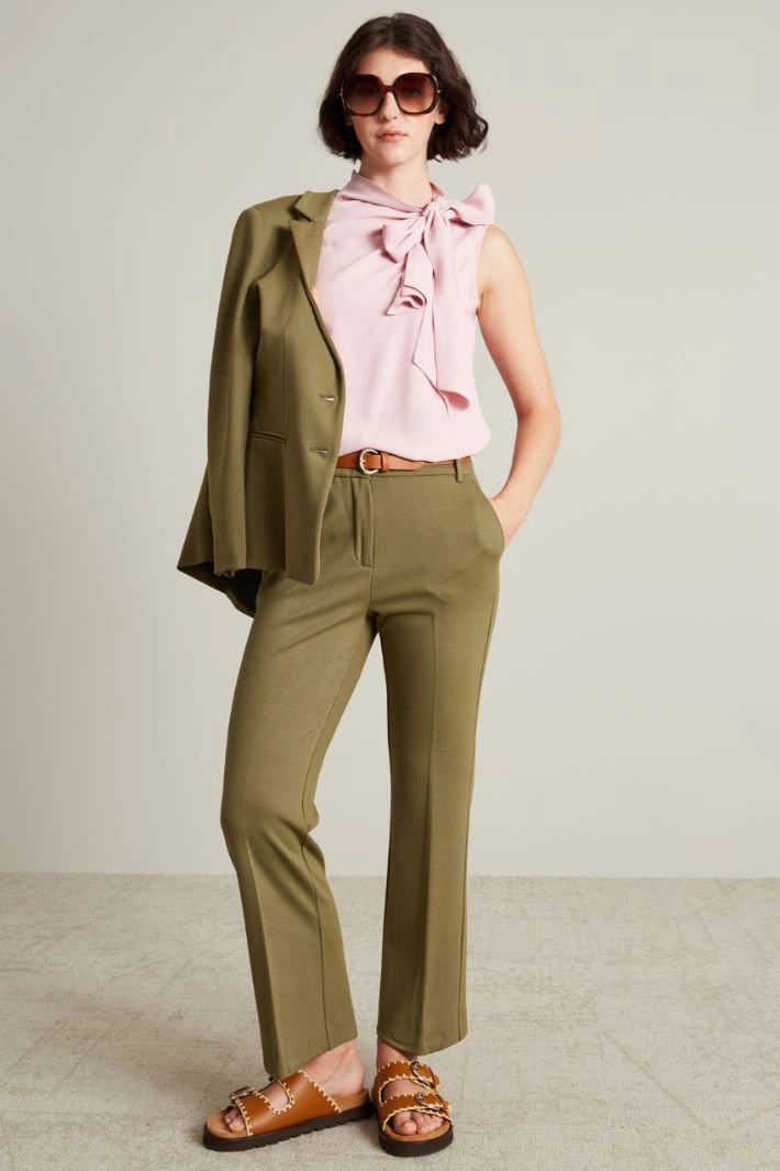 Flared trousers in stretch viscose blend jersey, with French pockets at the front and buttoned welt pockets at the back, pressed crease and hidden fastening with zip, button and hook.