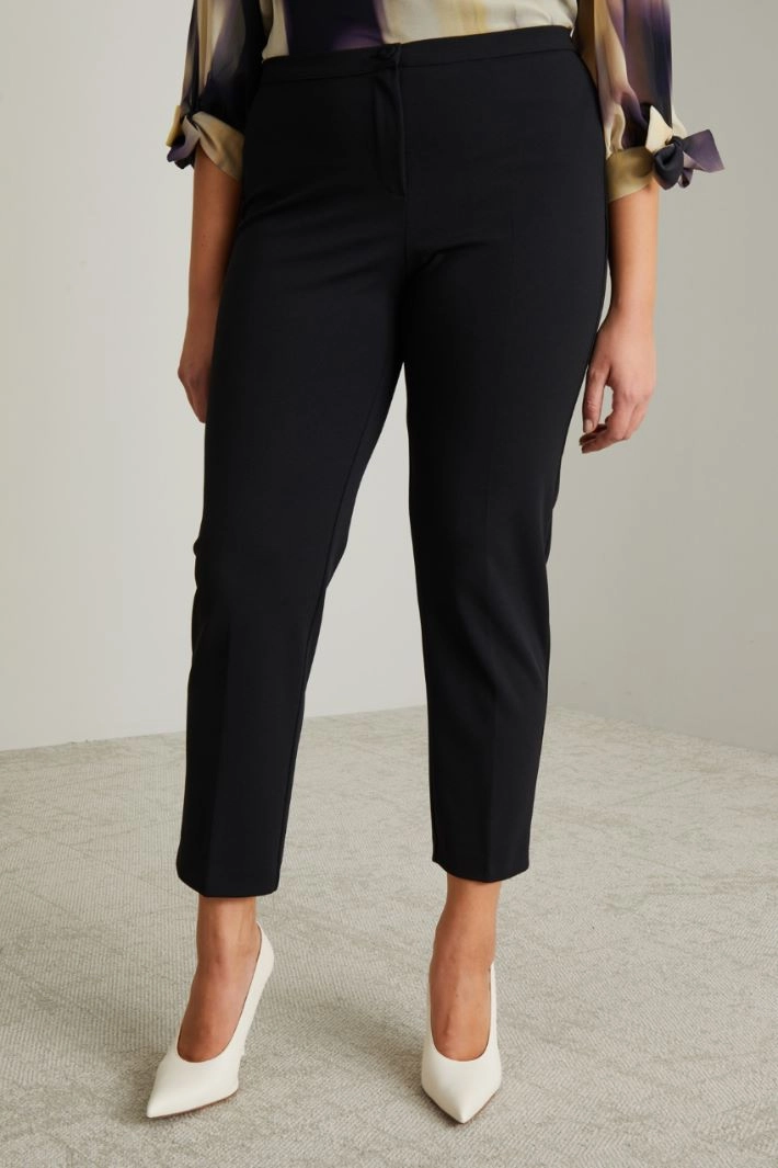 Regular-fit cigarette trousers in stretch jersey fabric, with elasticated waist at the back, pleats pressed lengthwise and fastening with hidden zip and button.
