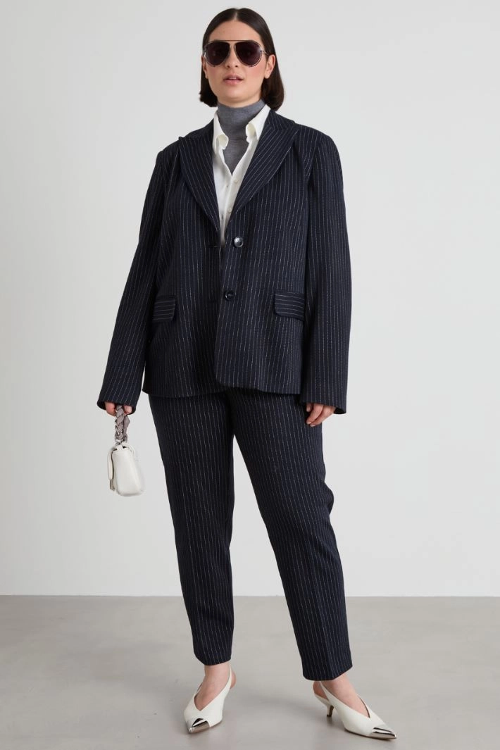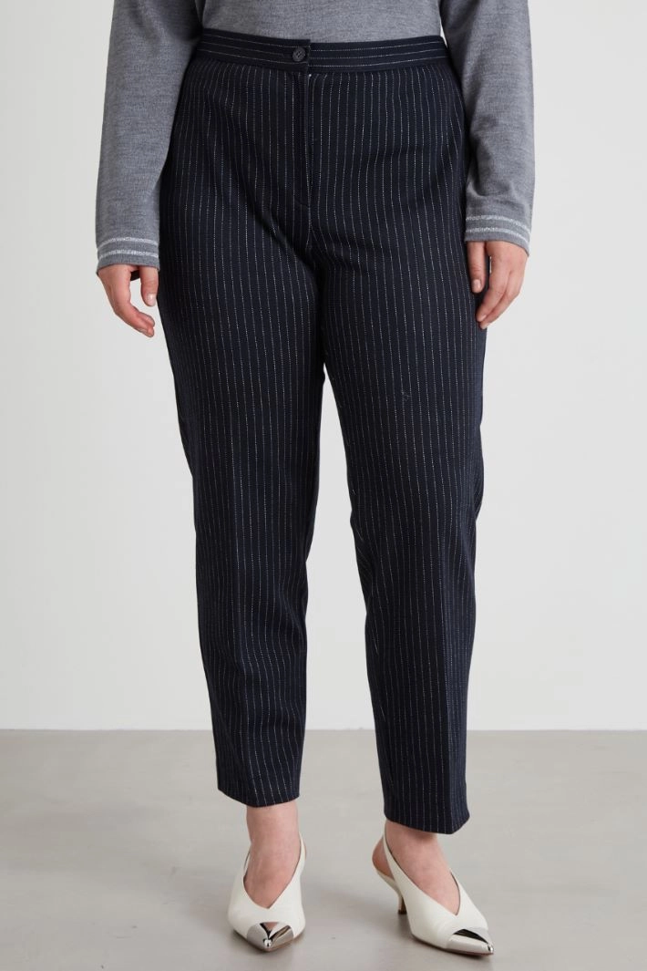 Pinstriped cigarette trousers in stretch viscose blend jersey, with elastic waistband insert on the back and pressed crease lengthwise. Zip and button fastening.