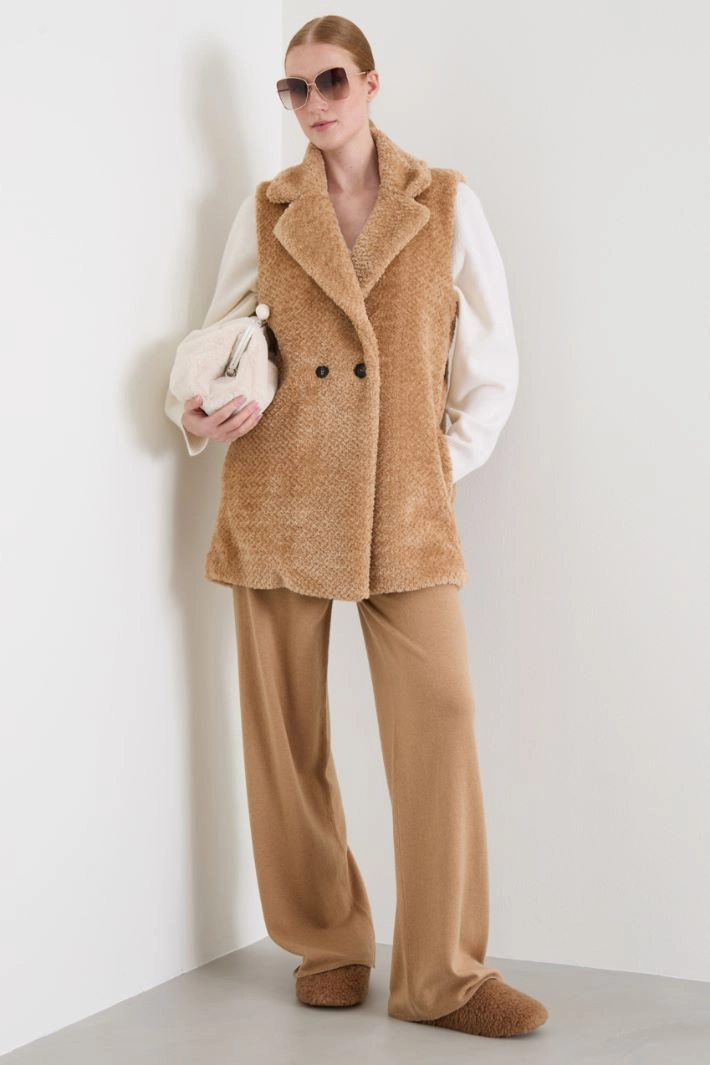 Straight-fit gilet in plush fabric, with lapel collar, inset side pockets. Double-breasted fastening with buttons. Lined.