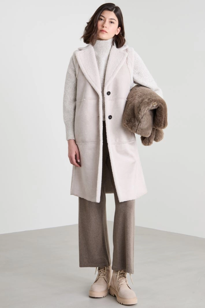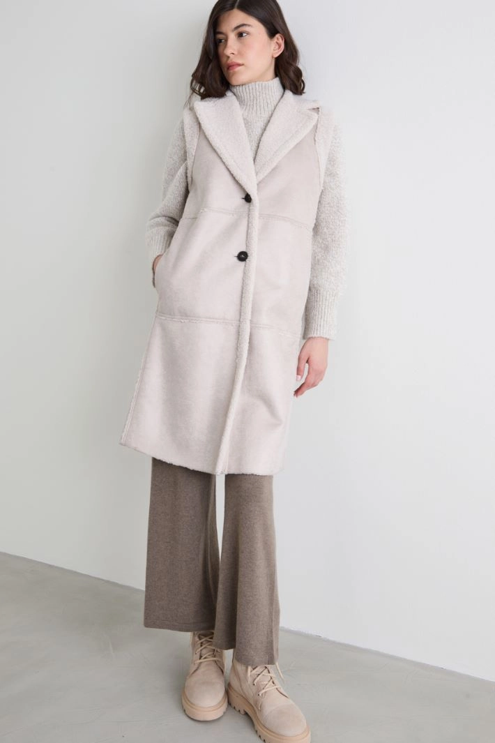 Long straight-fit gilet in faux sheepskin, with lapel collar and pockets sewn into the sides. Button fastening.