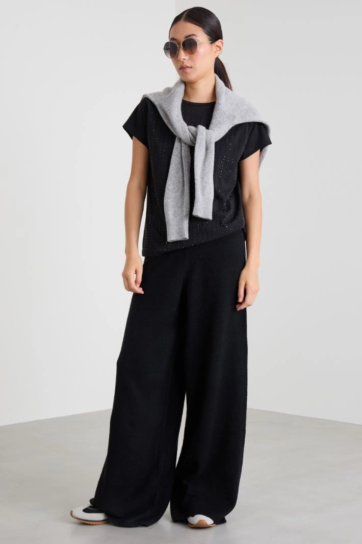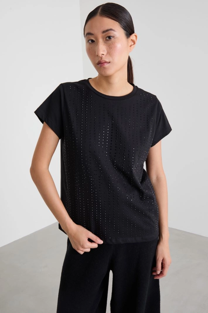 Straight-cut T-shirt in pure cotton jersey, with rhinestone motif applied on the front, crew neck and short sleeves.