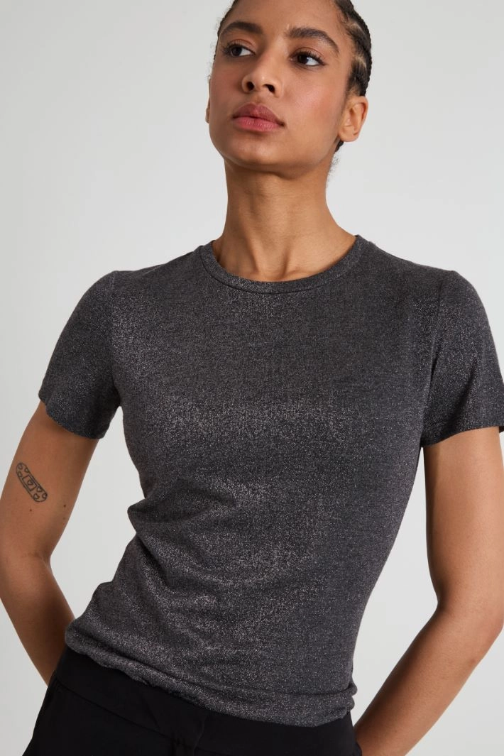 Slim-fit T-shirt in lamé viscose blend jersey, with crew neck and short sleeves.