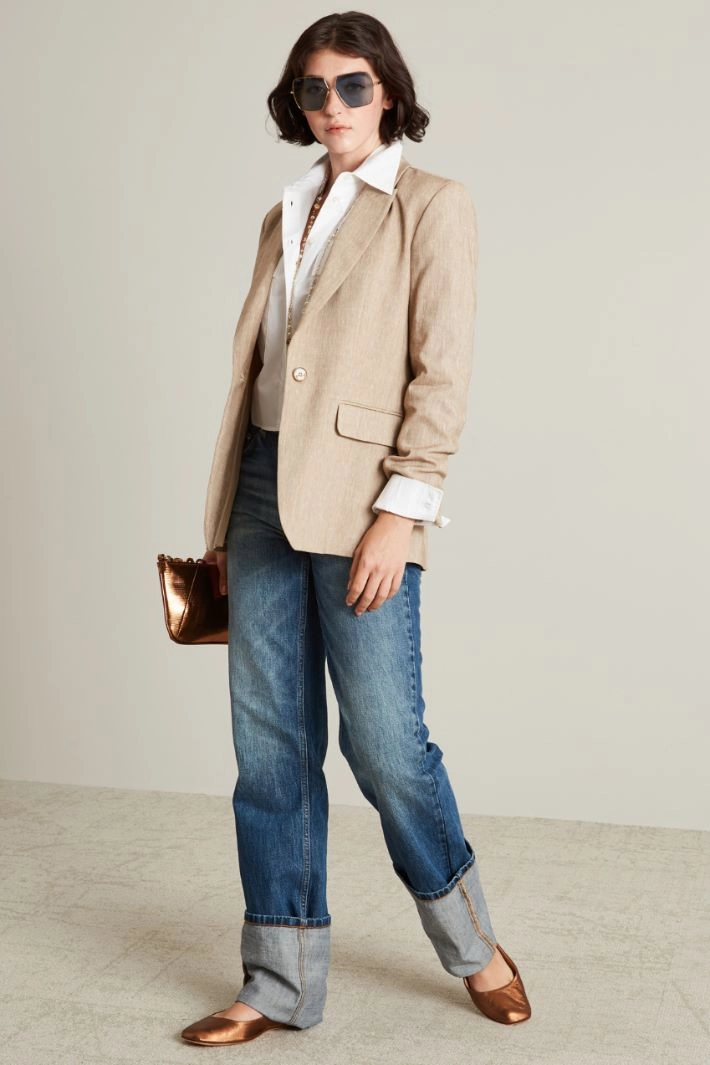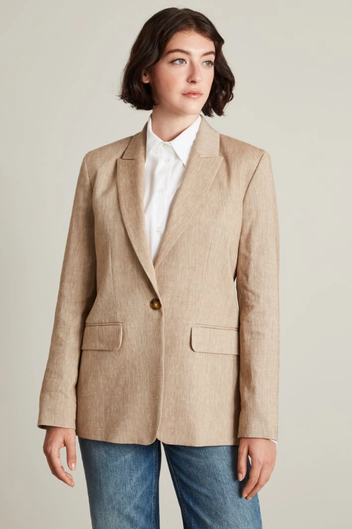 Straight-fit blazer in stretch linen and viscose blend canvas, with lapel collar, long sleeves with buttons, double-welt side pockets with flap and central vent on the back. Single-breasted fastening with a single button. Lined garment