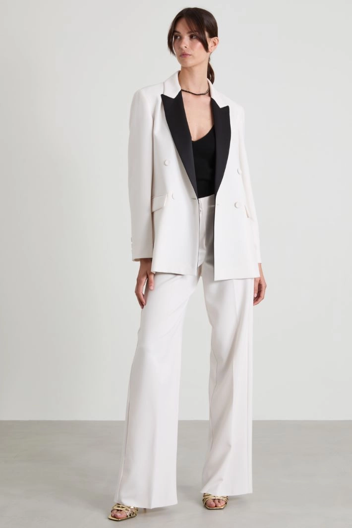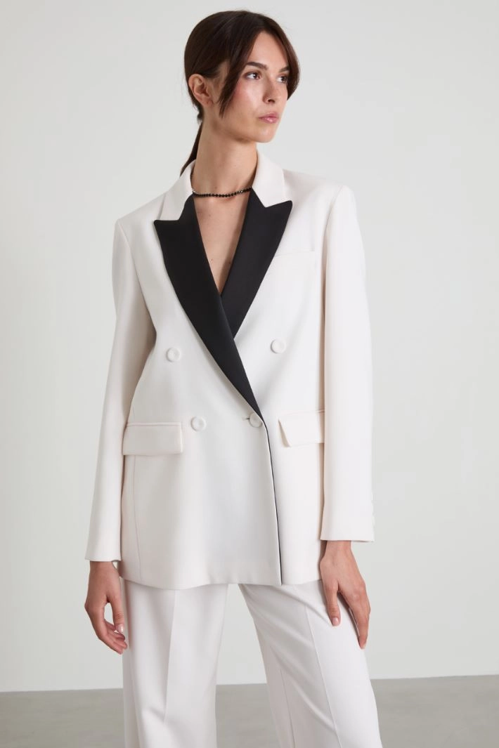 Regular-fit blazer in flowing fabric, with contrasting satin peak lapel, long sleeves with buttons, front flap pockets and a slit at the centre back. Double-breasted fastening with matching buttons. Lined.