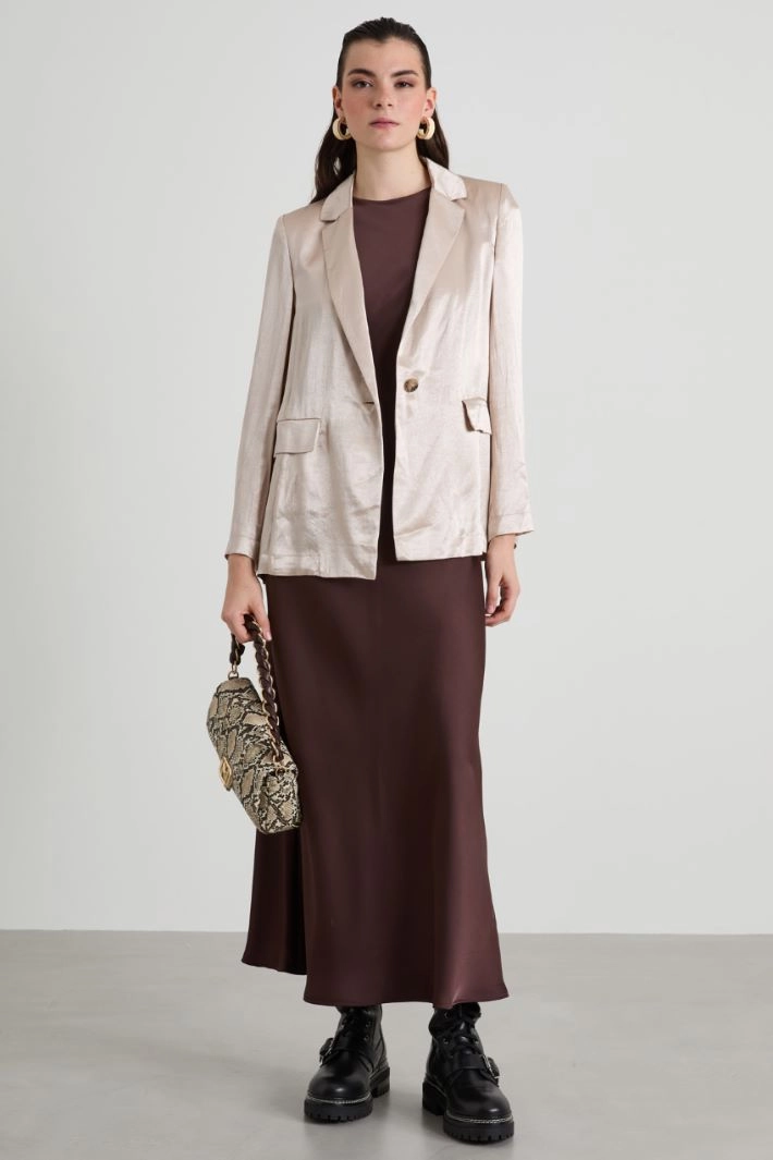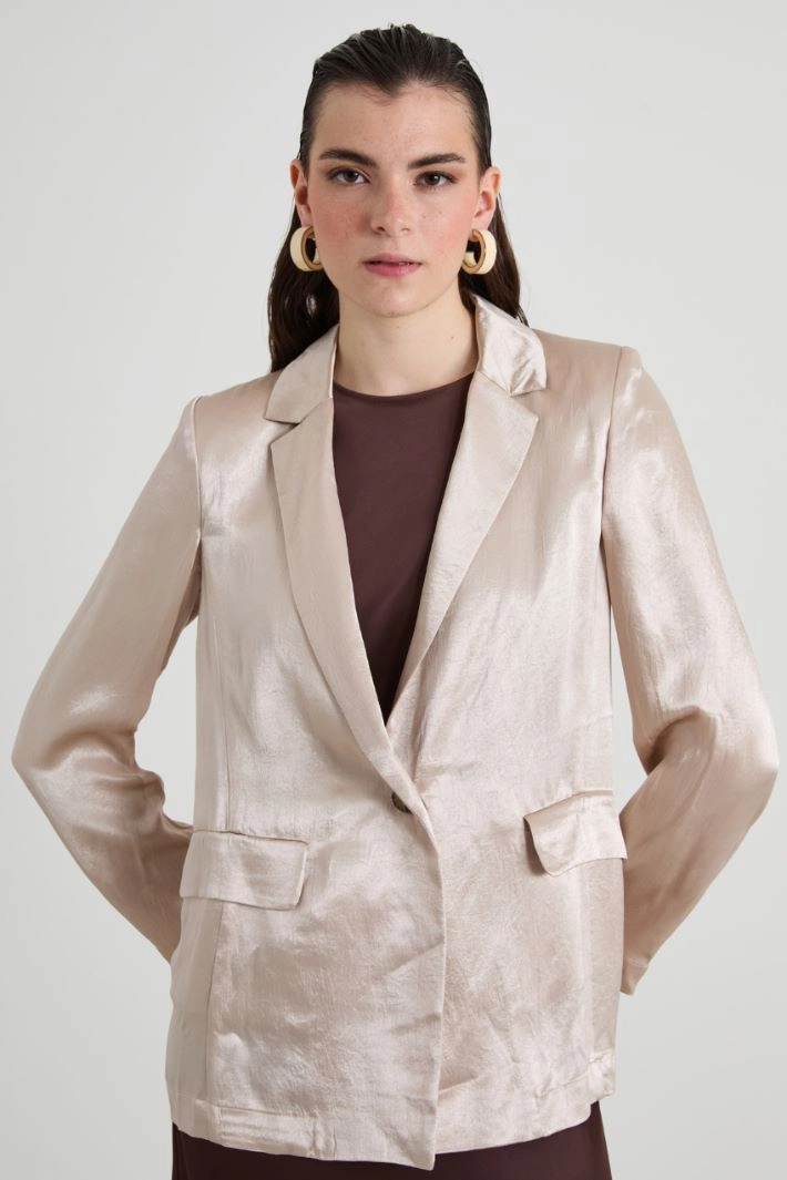 Deconstructed satin blazer with a crumpled finish, a lapel collar, long sleeves, welt pockets with flap and single-breasted fastening with a button. Unlined.