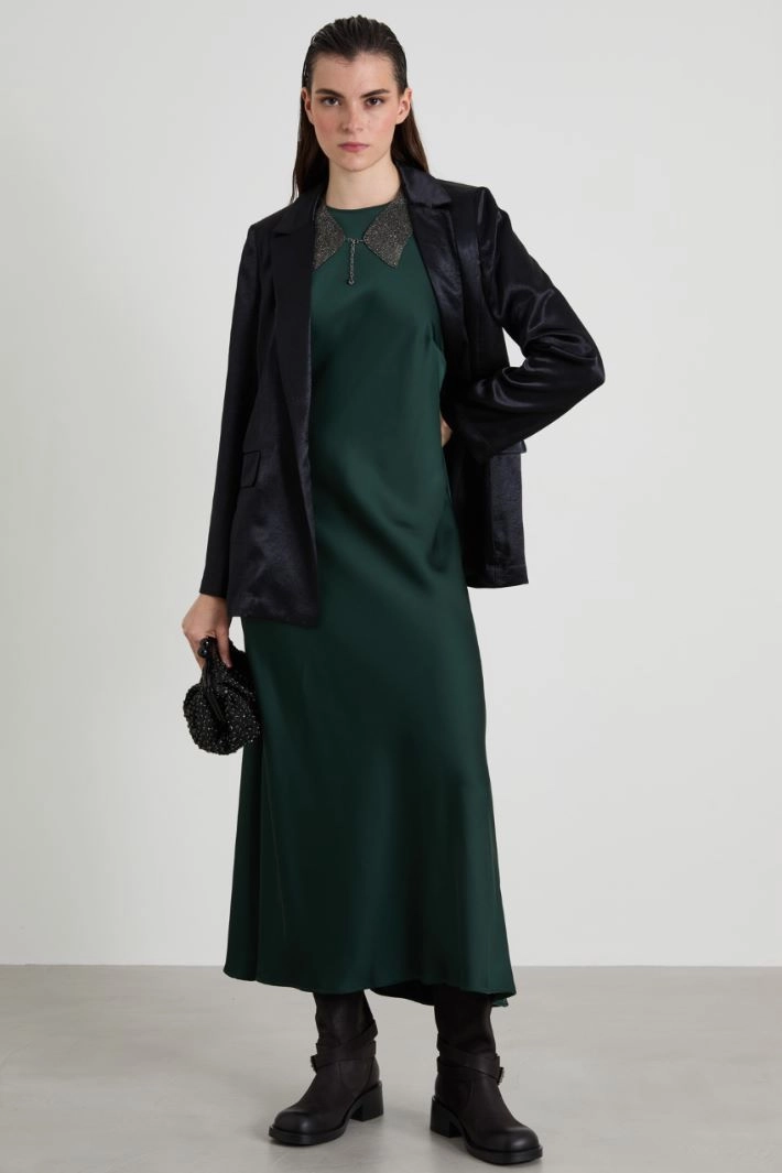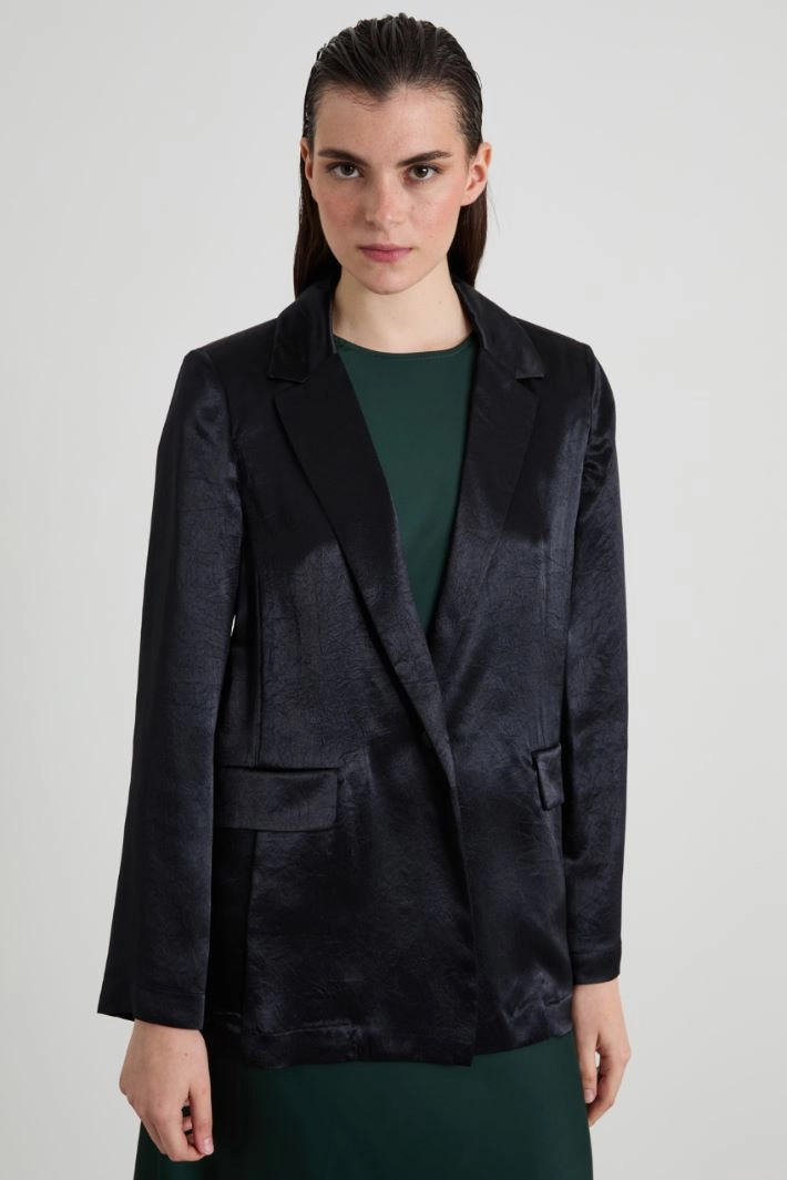 Deconstructed satin blazer with a crumpled finish, a lapel collar, long sleeves, welt pockets with flap and single-breasted fastening with a button. Unlined.
