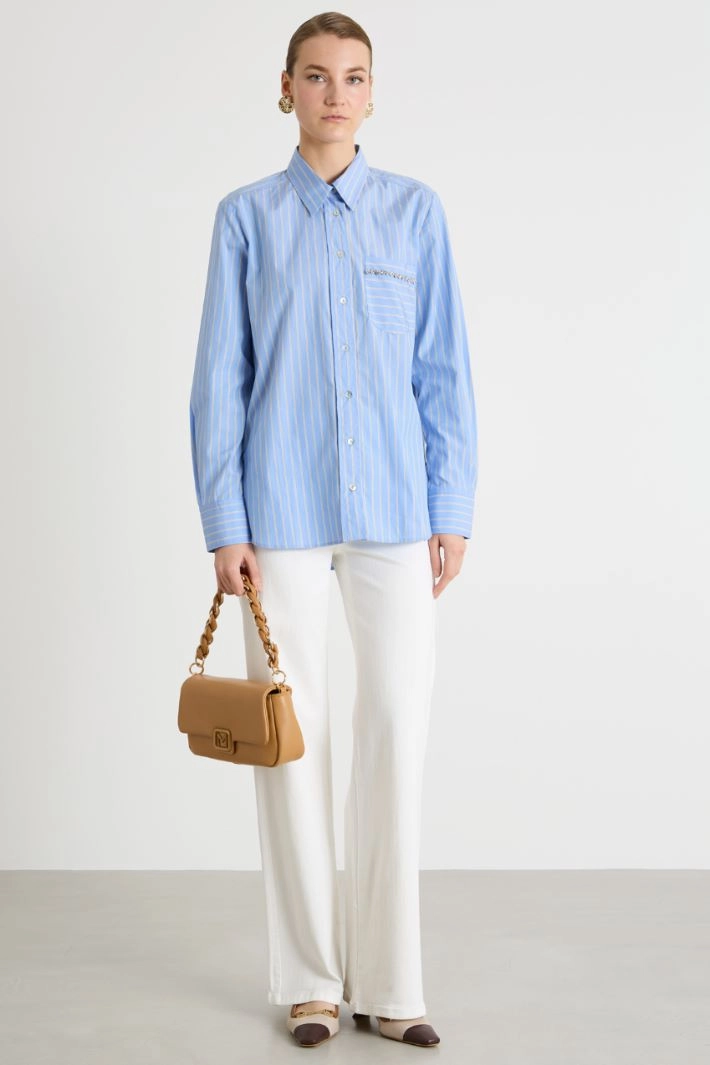 Straight-fit shirt in pure cotton poplin, styled with a point collar, a chest patch pocket embellished with a diamanté chain, long sleeves, a back yoke with a box pleat, and a rounded hem. Button fastening.