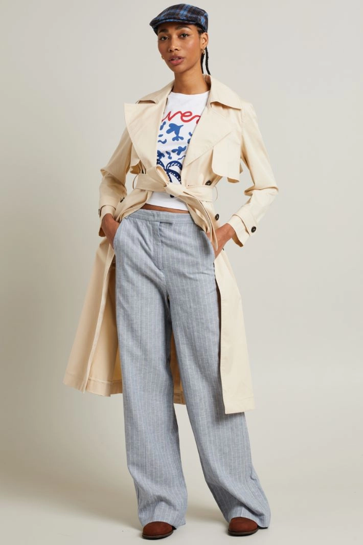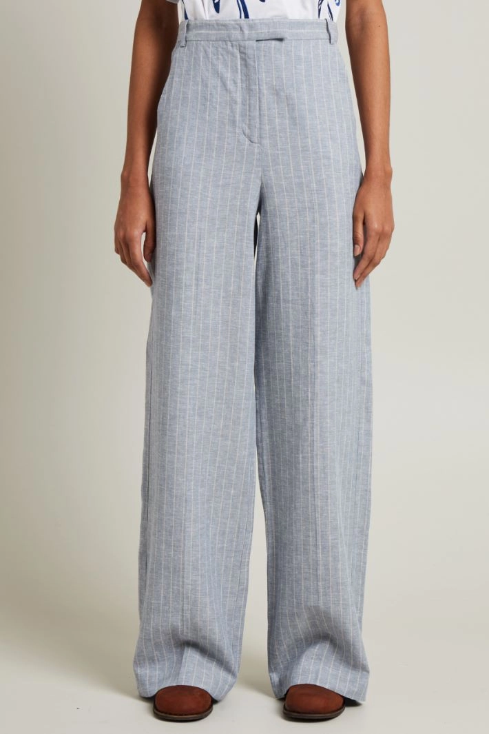Straight-fit palazzo trousers in yarn-dyed linen blend, with belt loops at the waist, French pockets at the front and double-welt pockets with button at the back, pleats pressed lengthwise and fastening with a hidden zip, button and hook.
