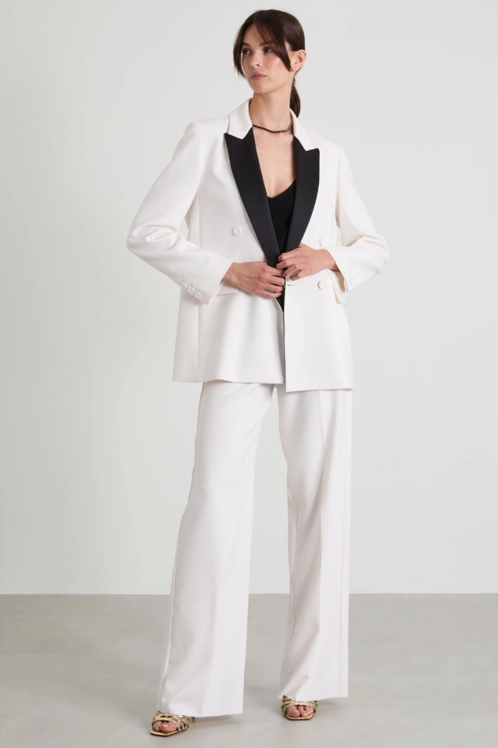 Straight-cut trousers in flowing fabric, with French pockets on the front, fake welt pockets on the back, pressed crease. Fastening with hidden zip and tone-on-tone buttons.