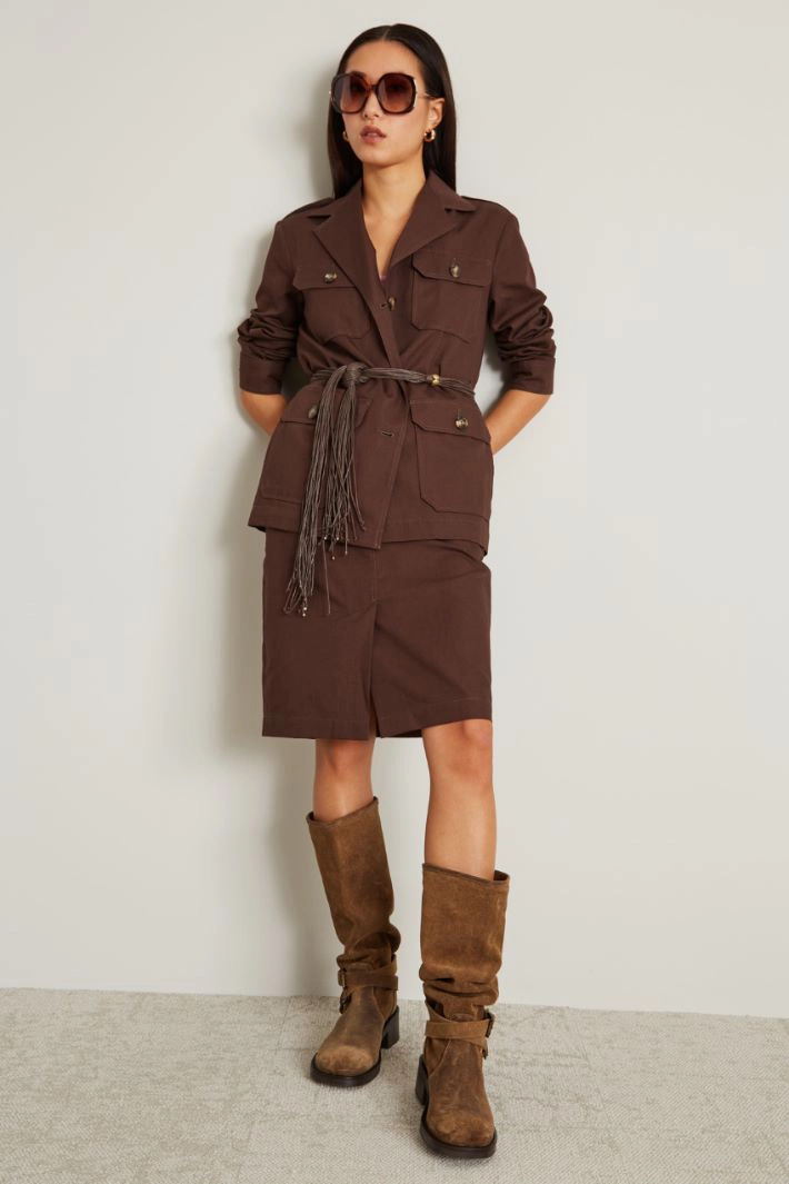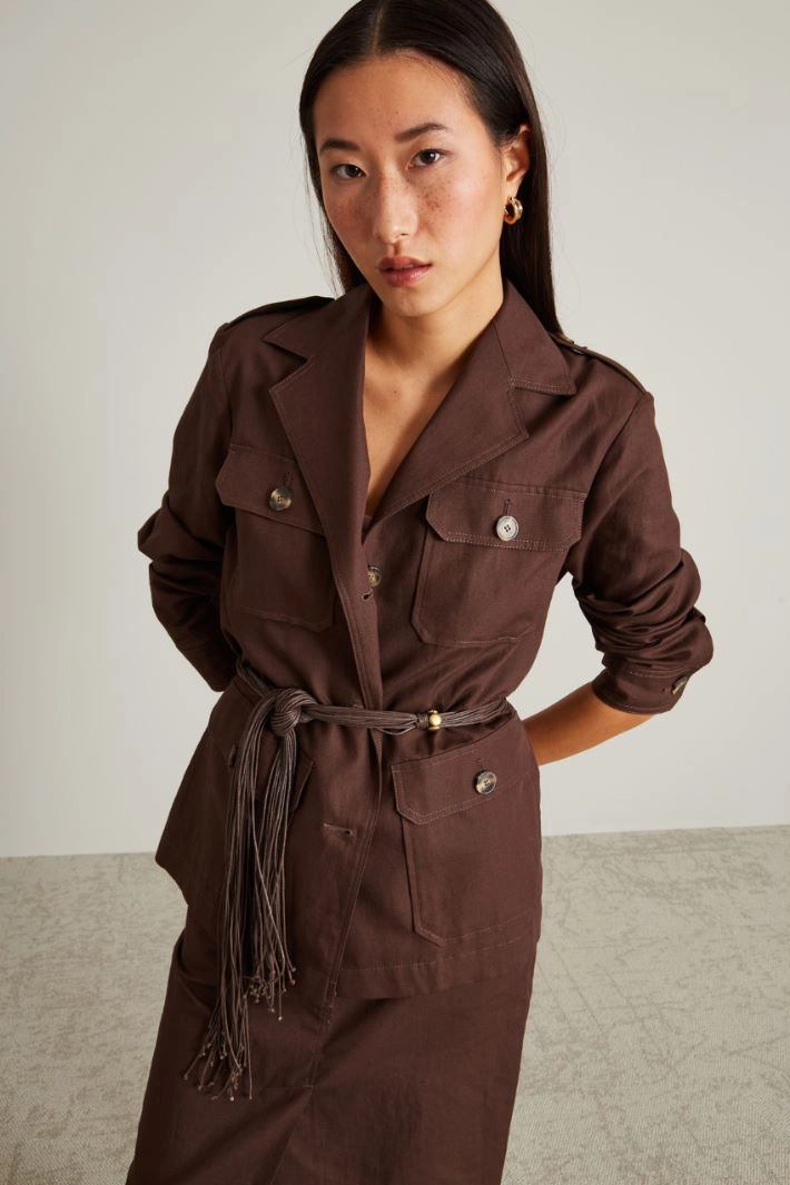Straight-fit Safari jacket in cotton and linen canvas, with lapel collar, shoulder epaulettes, long sleeves with cuffs, patch pockets with flap and button and central vent on the back. Single-breasted fastening with buttons. Unlined.