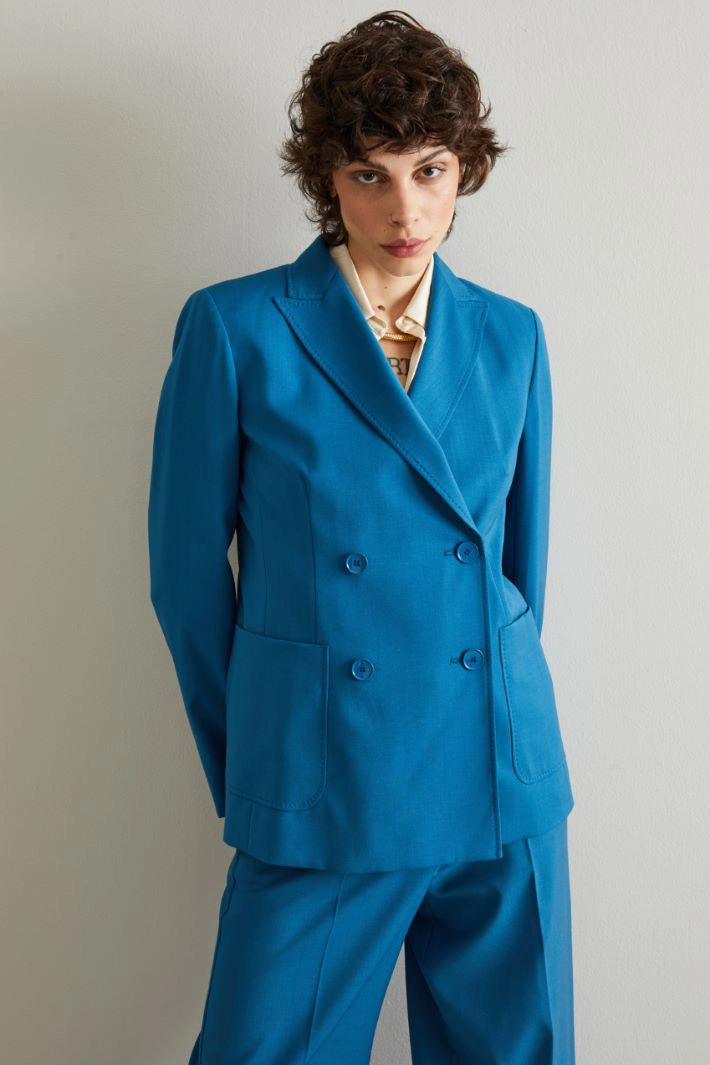Slightly fitted blazer in pure wool canvas with peak lapel, padded shoulders, long sleeves with buttons, patch pockets on the front, central vent on the back, tack finishing and double-breasted fastening with buttons. Lined.