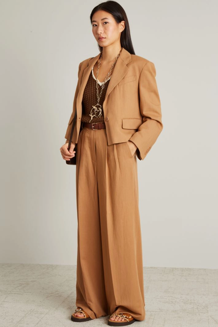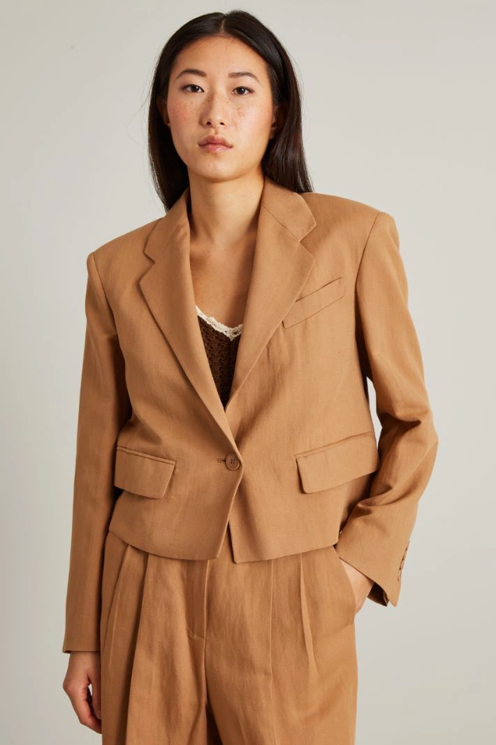 Short straight-fit blazer in diagonal viscose and cotton fabric, with lapel collar, long sleeves with buttons, welt pocket on the chest and double welt pocket with flap on the sides, single-breasted fastening with tone-on-tone button. Lined garment.
