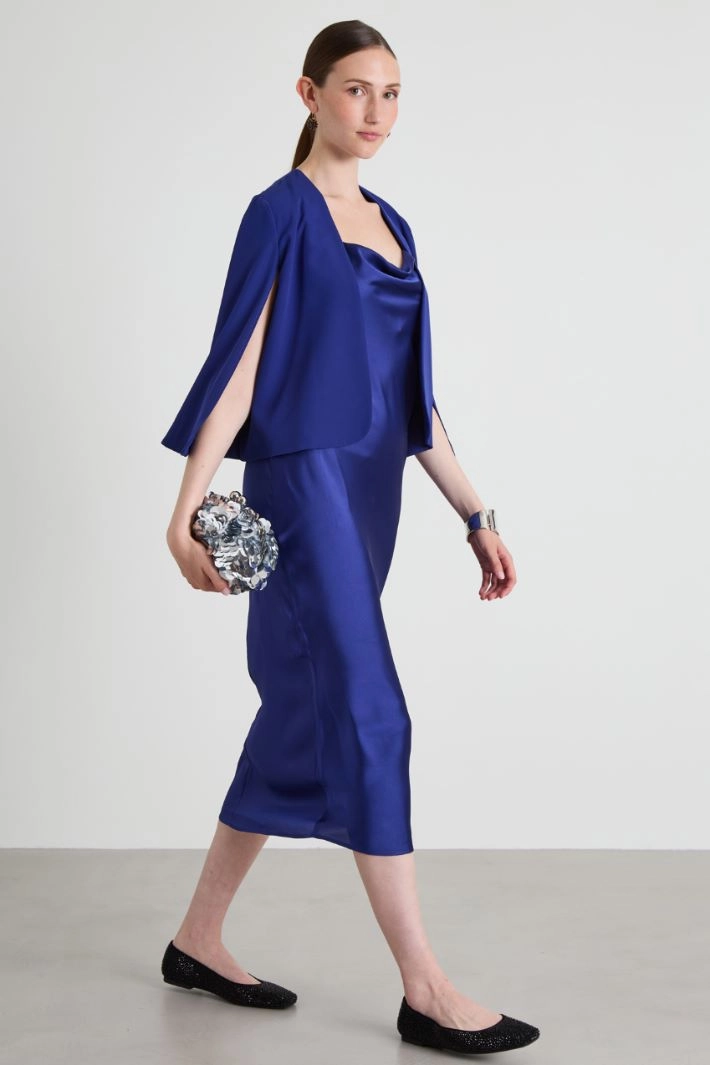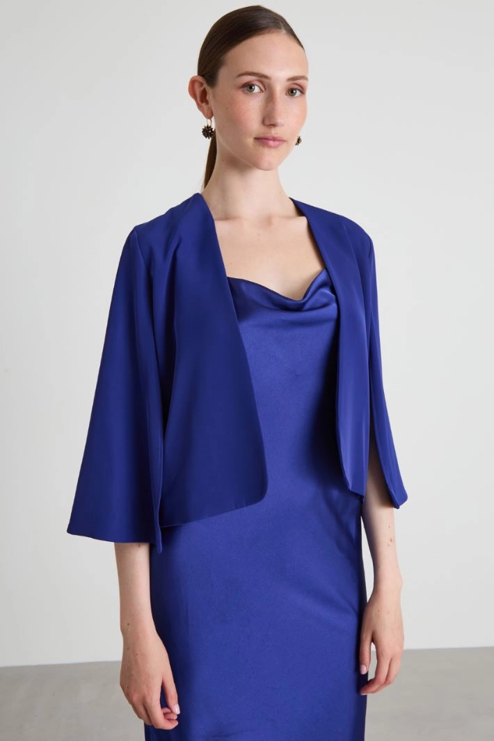 Short straight-fit jacket in flowing stretch fabric, with V-neck and long sleeves with full-length slit. Without fastening. Semi-lined garment.