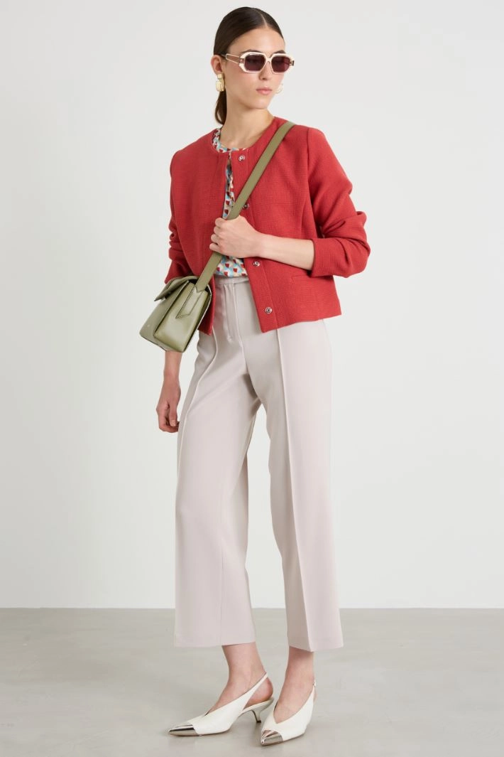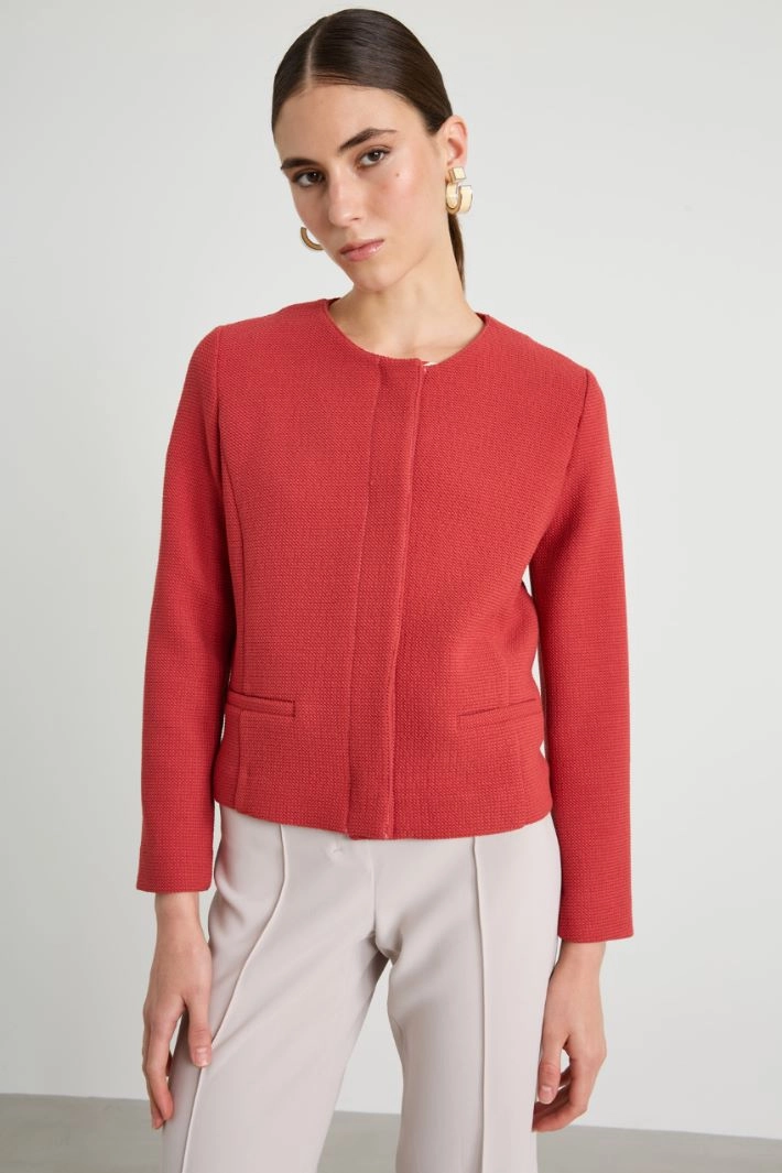 Short fitted jacket in stretch viscose blend basketweave, with round neck, long sleeves and welt pockets. Fastening with hidden press studs.