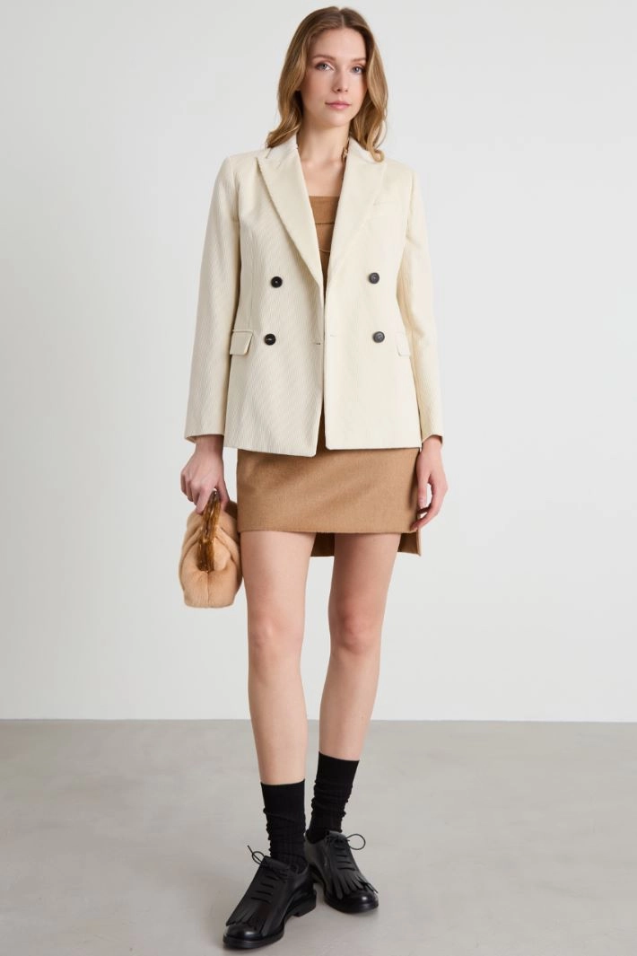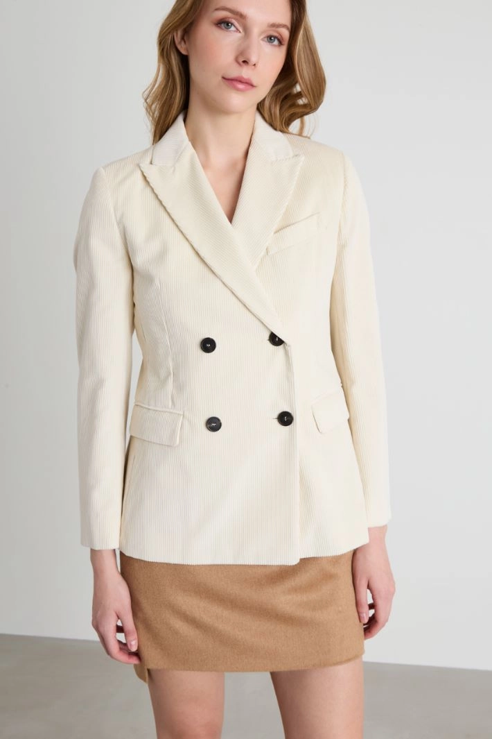 Straight-fit blazer in pure cotton corduroy, with lapel collar, long sleeves with buttons, double-welt side pockets with flap and central vent on the back. Double-breasted fastening with buttons. Lined.
