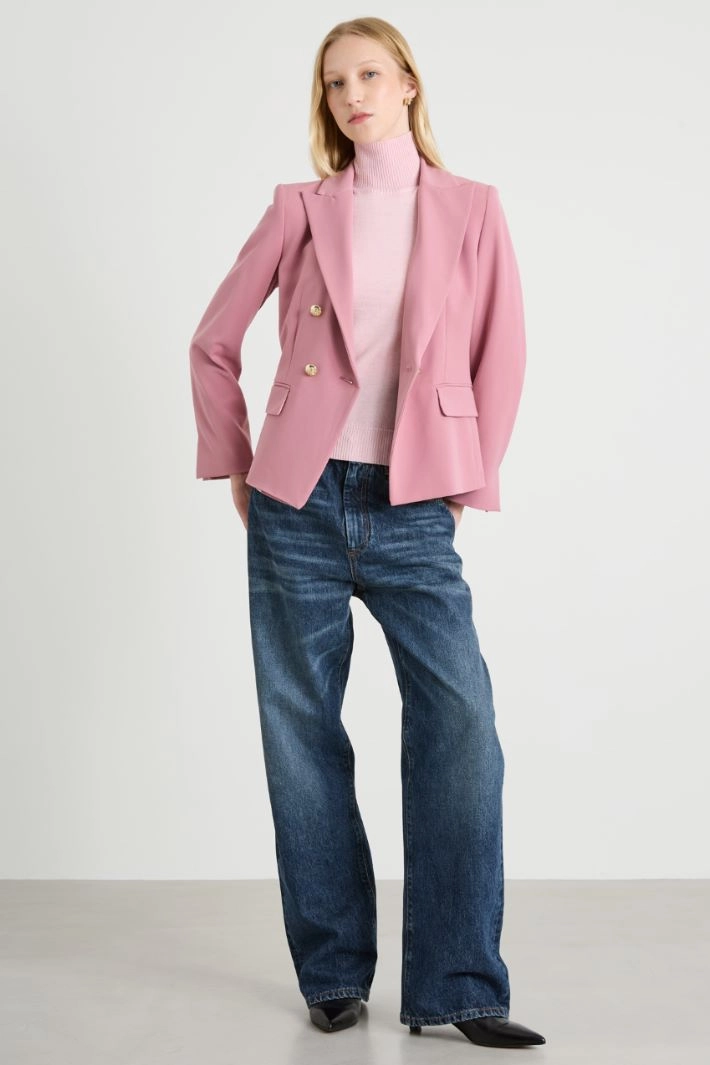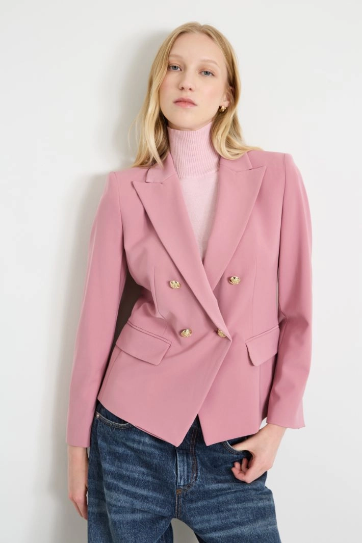 Fitted blazer in stretch fabric, with lapel collar, long sleeves, flap pockets and double-breasted button fastening. Lined.