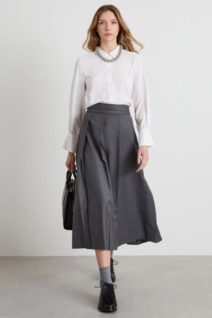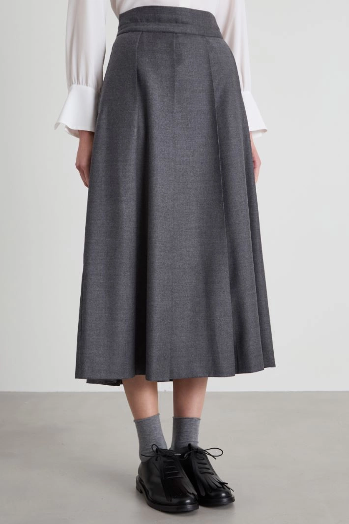 A-line midi skirt in stretch wool flannel, with pleated design, adjustable waistband detail, side French pockets and slit at the bottom. Invisible zip fastening at the side.