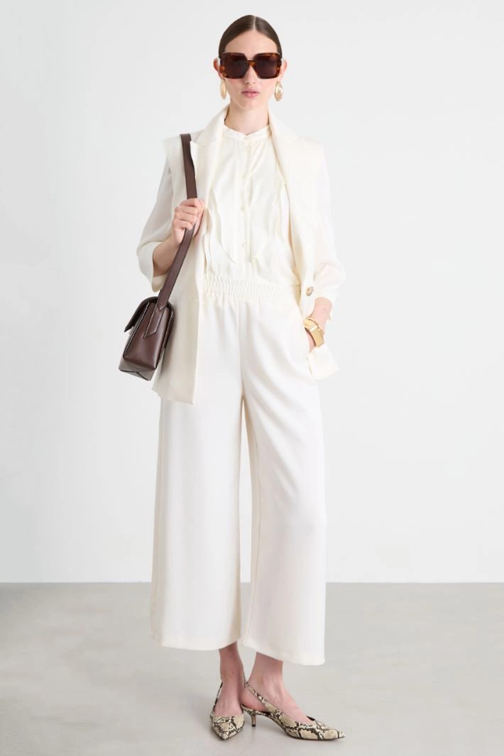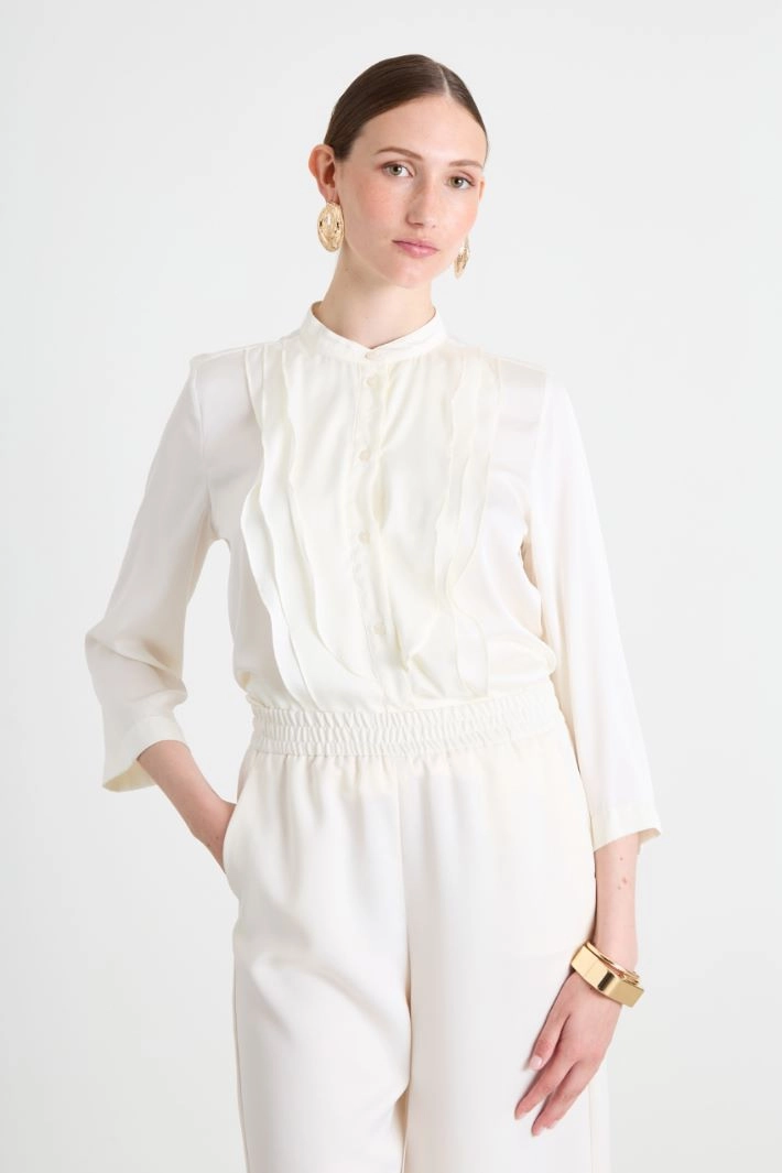 Straight-cut satin shirt with Mandarin collar, ruffle detail on the front, three-quarter sleeves and side slits at the bottom of the garment. Button fastening.