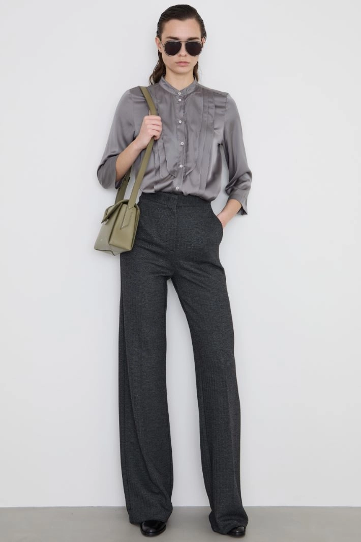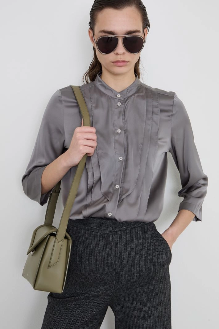 Straight-cut satin shirt with Mandarin collar, ruffle detail on the front, three-quarter sleeves and side slits at the bottom of the garment. Button fastening.