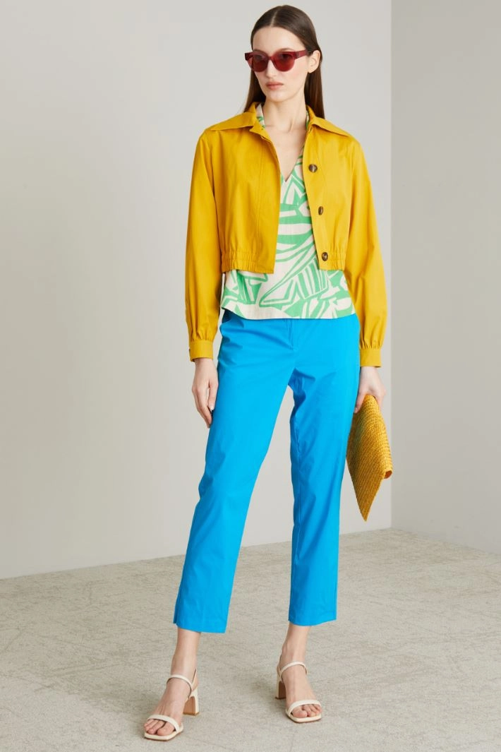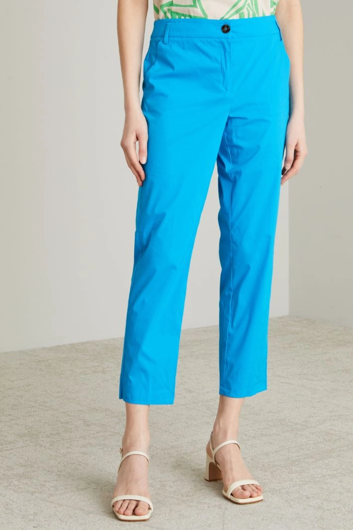Straight-cut trousers in cotton poplin with waistband and belt loops. French and welt pockets on the back. Zip and button fastening.