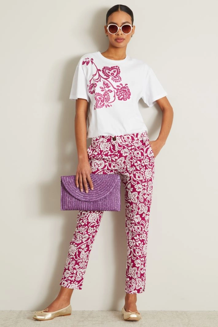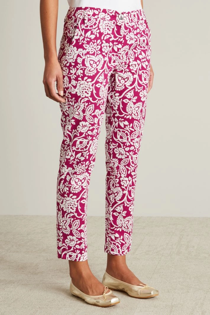 Chino trousers in stretch cotton poplin, with French pockets and slits at the bottom. Button fastening and hidden zip.