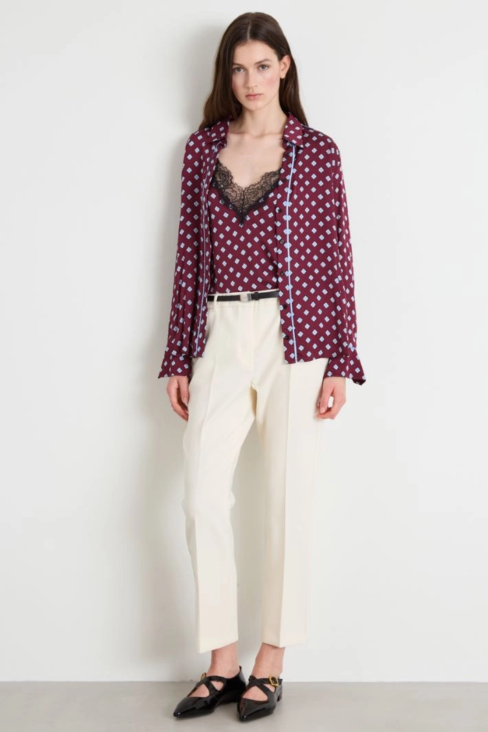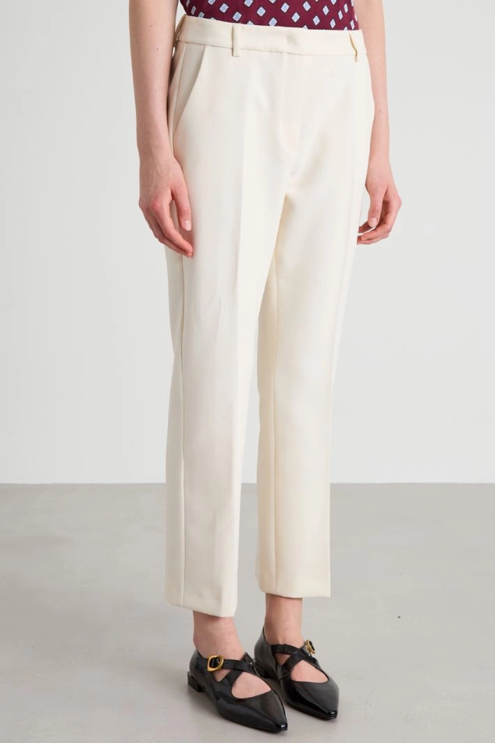 Cady cigarette trousers with belt loops at the waist, French pockets at the front, double welt pockets at the back and crease ironed along the length. Hidden fastening with zip, button and hook.