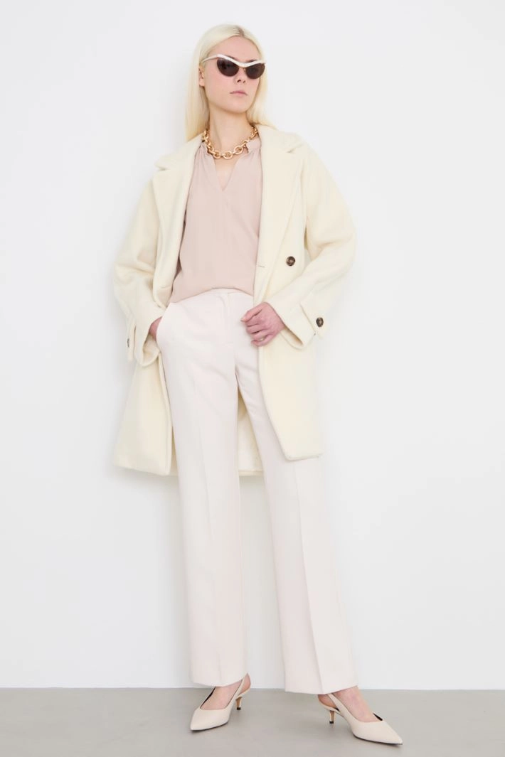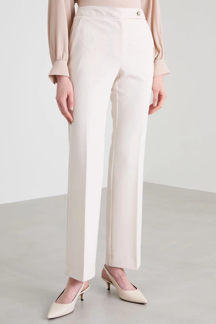 Slightly flared trousers in stretch viscose blend canvas, with French side pockets, crease along the length and fastening with hidden zip and buttons.