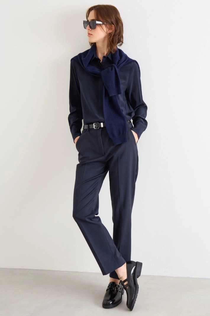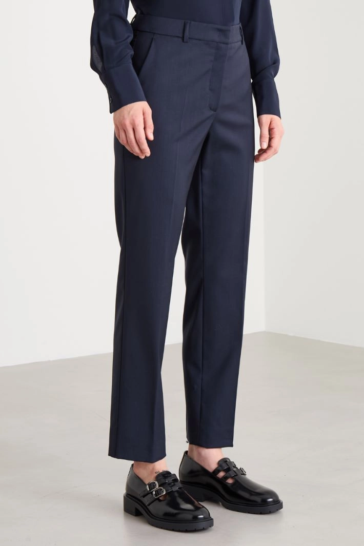 Cigarette trousers in pure wool canvas, with belt loops at the waist, side French pockets and double-welt pockets with button on the back, crease pressed lengthwise and hidden fastening with zip, button and hook.