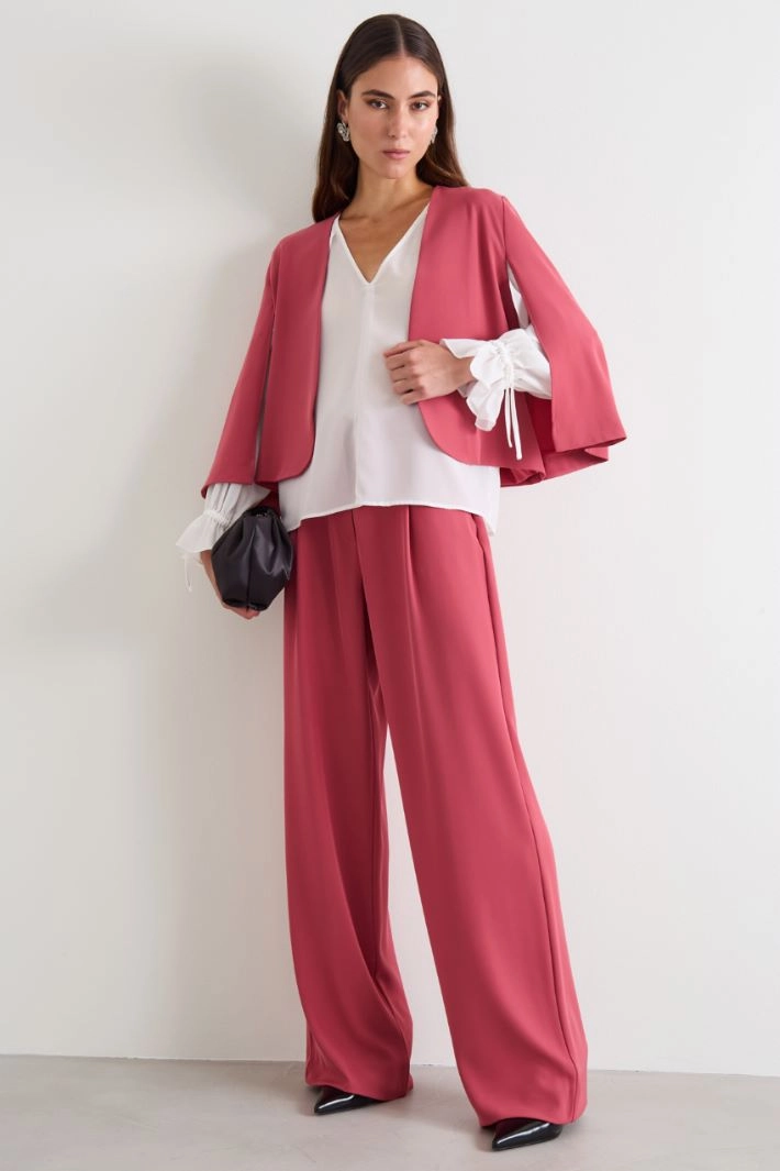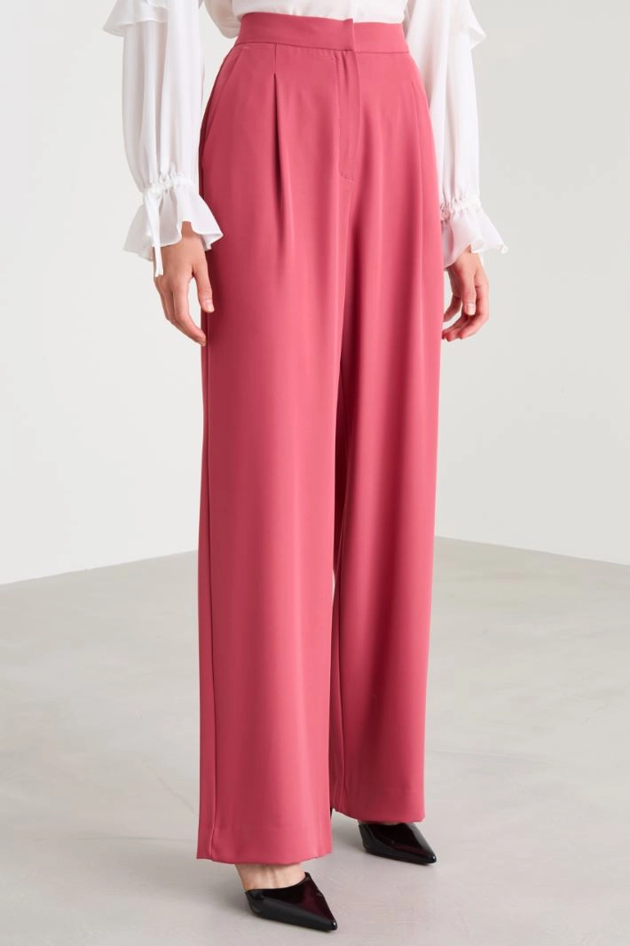 Straight-fit trousers in flowing fabric, with pleats and French pockets. Hidden fastening with zip, button and hook.