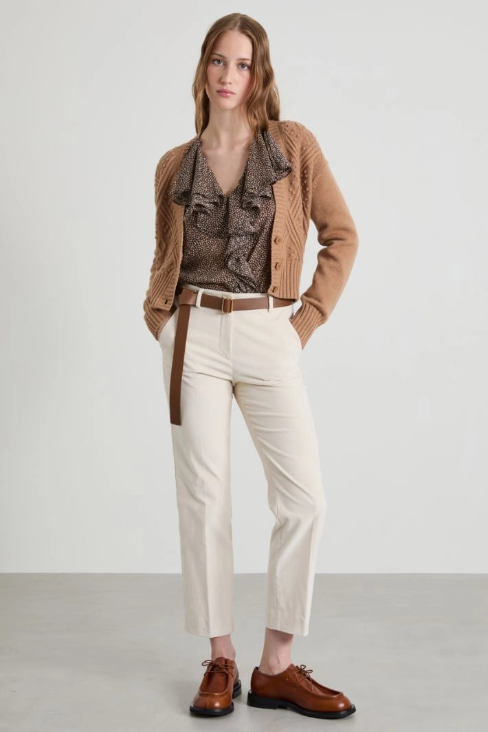 Cigarette trousers in stretch cotton corduroy, with belt loops at the waist, side French pockets and double welt pockets with button on the back, pressed crease. Hidden fastening with zip, button and hook.