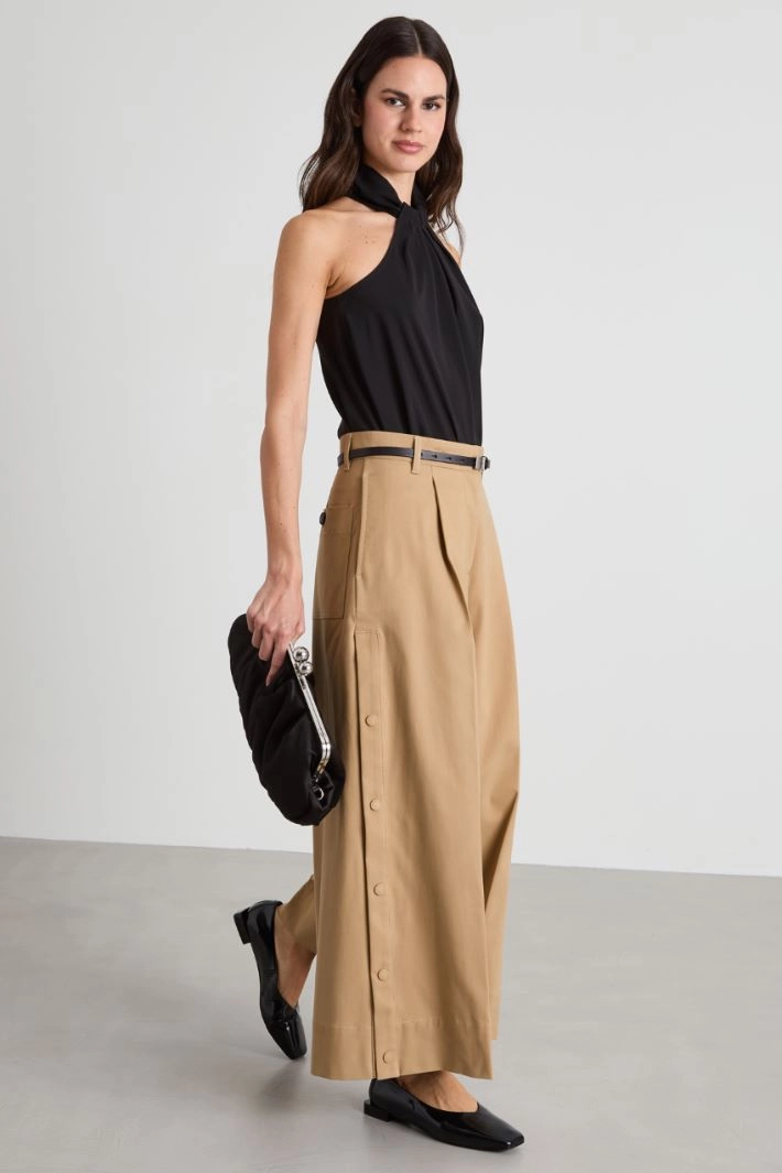 Loose-fitting trousers in stretch cotton gabardine, with belt loops and darts at the waist, inset side pockets, patch pockets on the back and a snap button motif along the sides. Concealed fastening with zip, button and hook.
