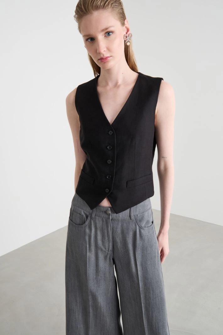 Cropped fitted waistcoat crafted in viscose and linen canvas, featuring a V-neck, front welt pockets and an adjustable buckled waist strap at the back. Lined. Button fastening.