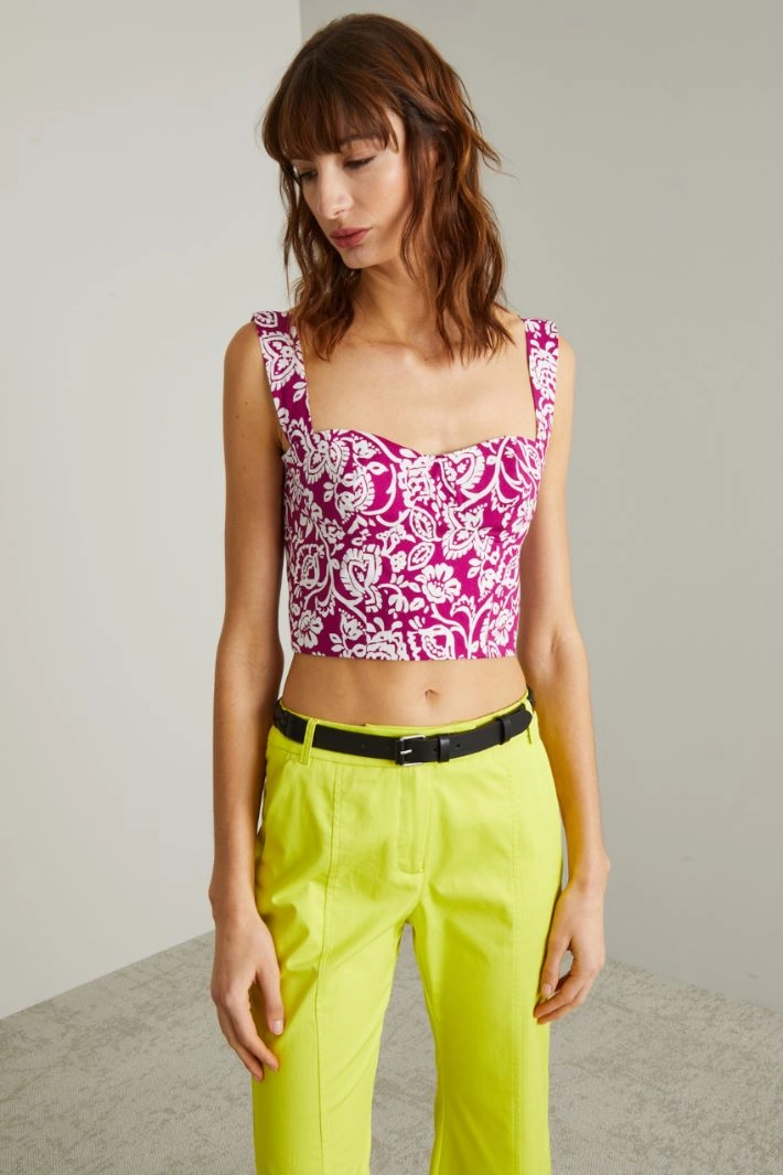 Fitted cropped bustier top in stretch cotton poplin with an all-over print, with a sweetheart neckline, wide shoulder straps and a zip fastening on the back.