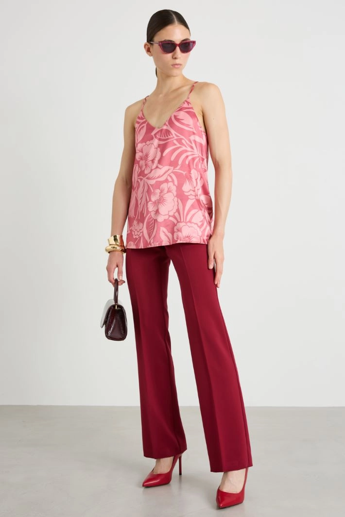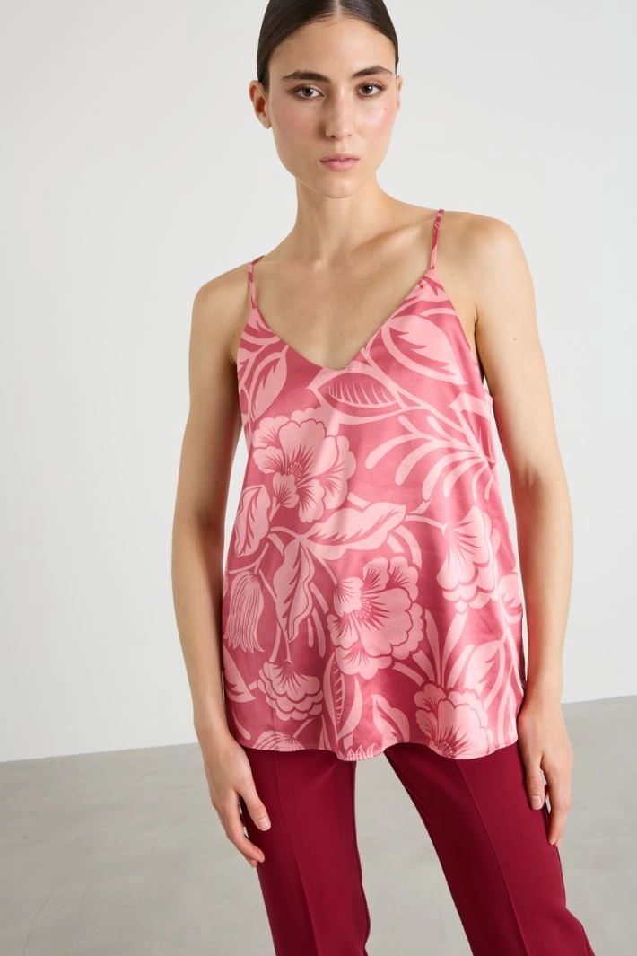 Straight-cut top in printed stretch satin, with V-neck and thin shoulder straps.