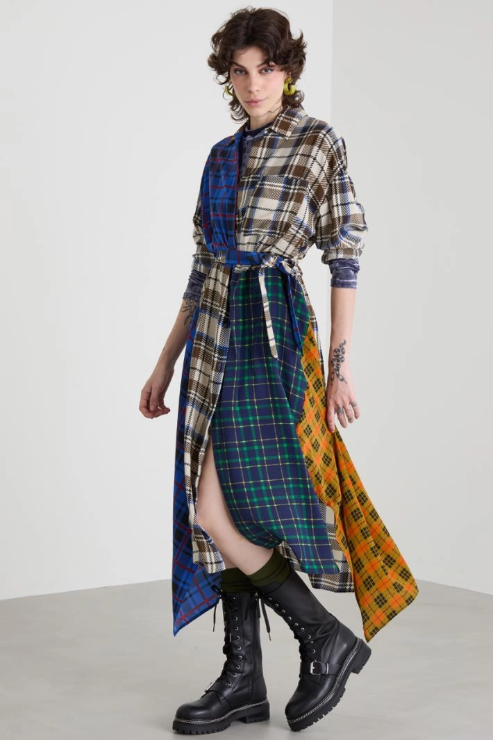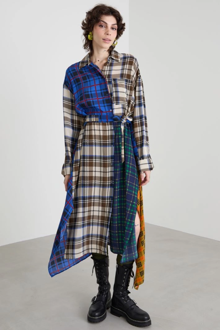 Patchwork shirt dress in pure silk crepe de chine printed all over, with a classic collar, long sleeves with cuff and button, breast pocket and inset side pockets. Asymmetrical hem with slits at the bottom. Fastening with visible buttons. Matching sash.