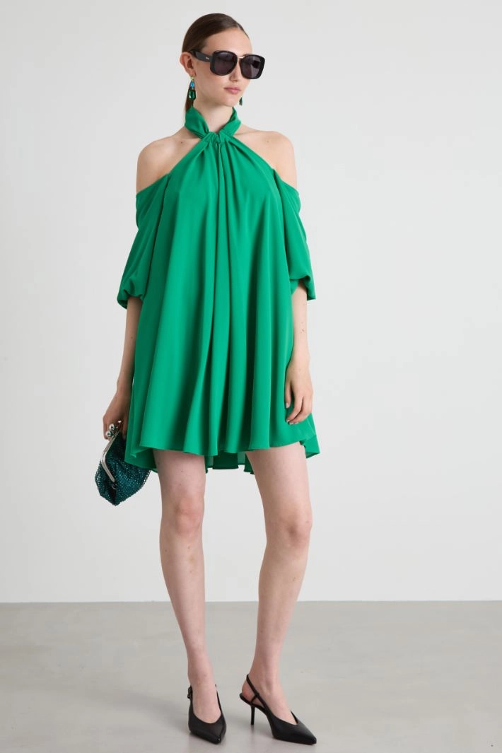 Loose and flared dress in flowing fabric, with an halter neckline, long balloon sleeves with elastic bottom and asymmetrical bottom longer at the back. Teardrop fastening with buttons on the back