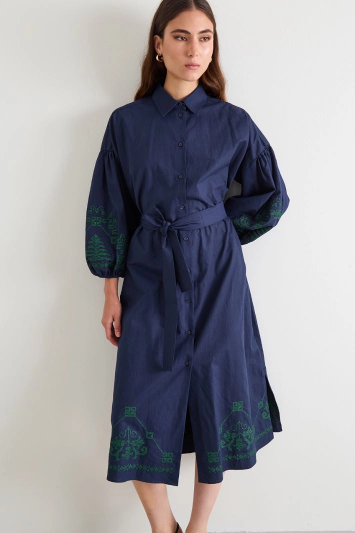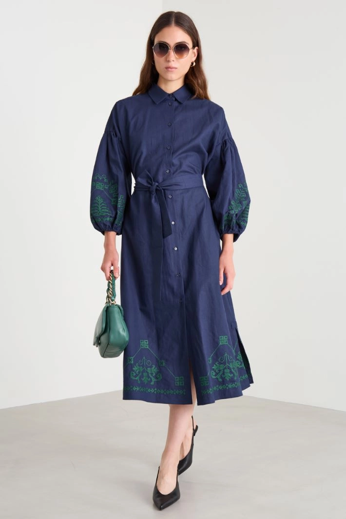 Flared shirt dress in cotton and linen canvas, with embroidered motifs, classic collar, long sleeves with dropped hem and elastic insert, inset side pockets and slits at the hem. Full-length button fastening and matching sash.