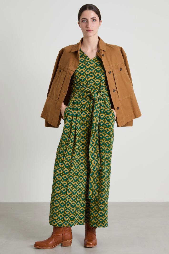 Loose-fitting jumpsuit in pure silk crepe de chine printed all over, with V-neck, short sleeves and pockets inset in the side seams. Matching belt in tone. Teardrop fastening with button and invisible zip on the back. Semi-lined garment.