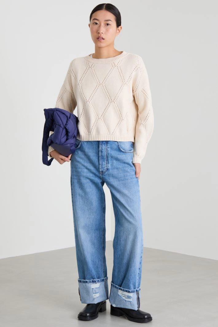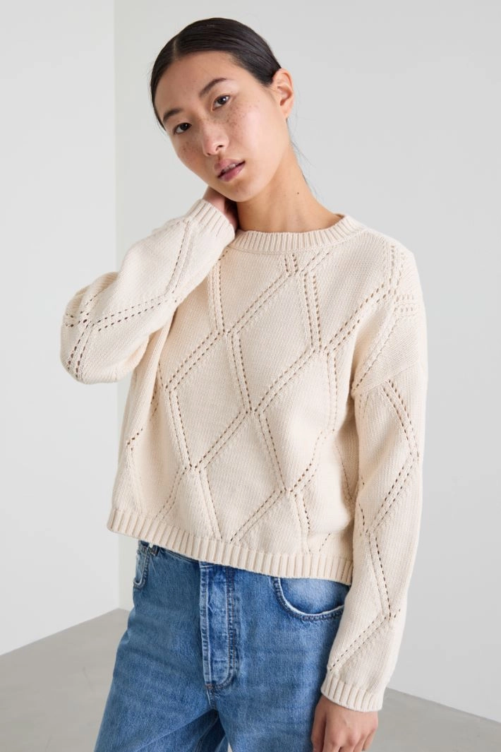 Straight-cut sweater in cotton blend yarn, with diamond-shaped openwork, round neckline, long dropped sleeves and asymmetrical hem that is longer at the back. Ribbed trim.