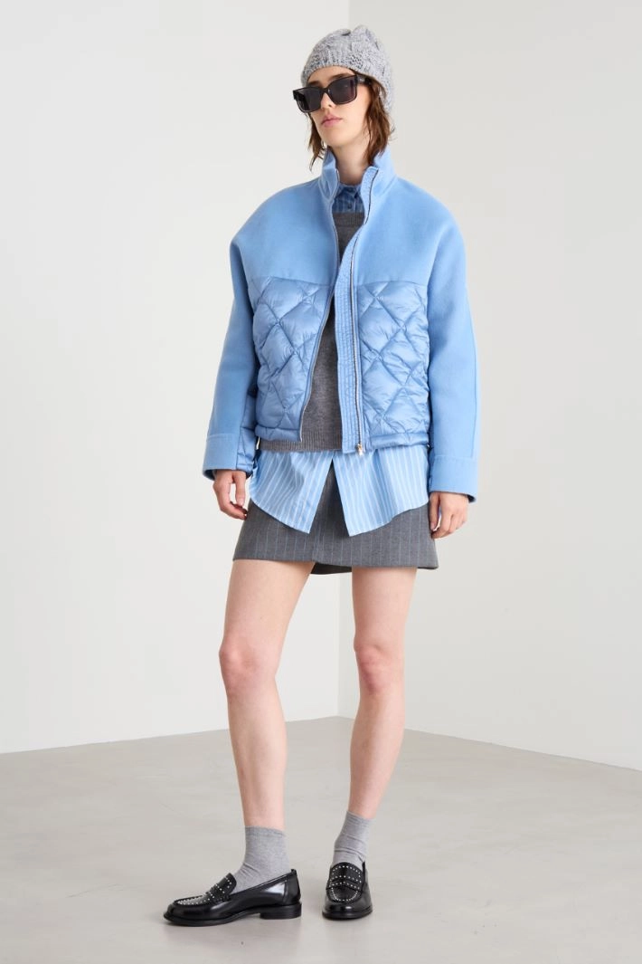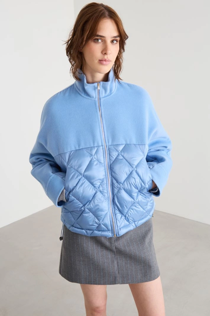 Padded bimaterial jacket with a straight cut in quilted technical satin, with double drap insert, high neck, long sleeves, side kangaroo pockets and drawstring at the bottom of the garment. Single-breasted zip fastening.