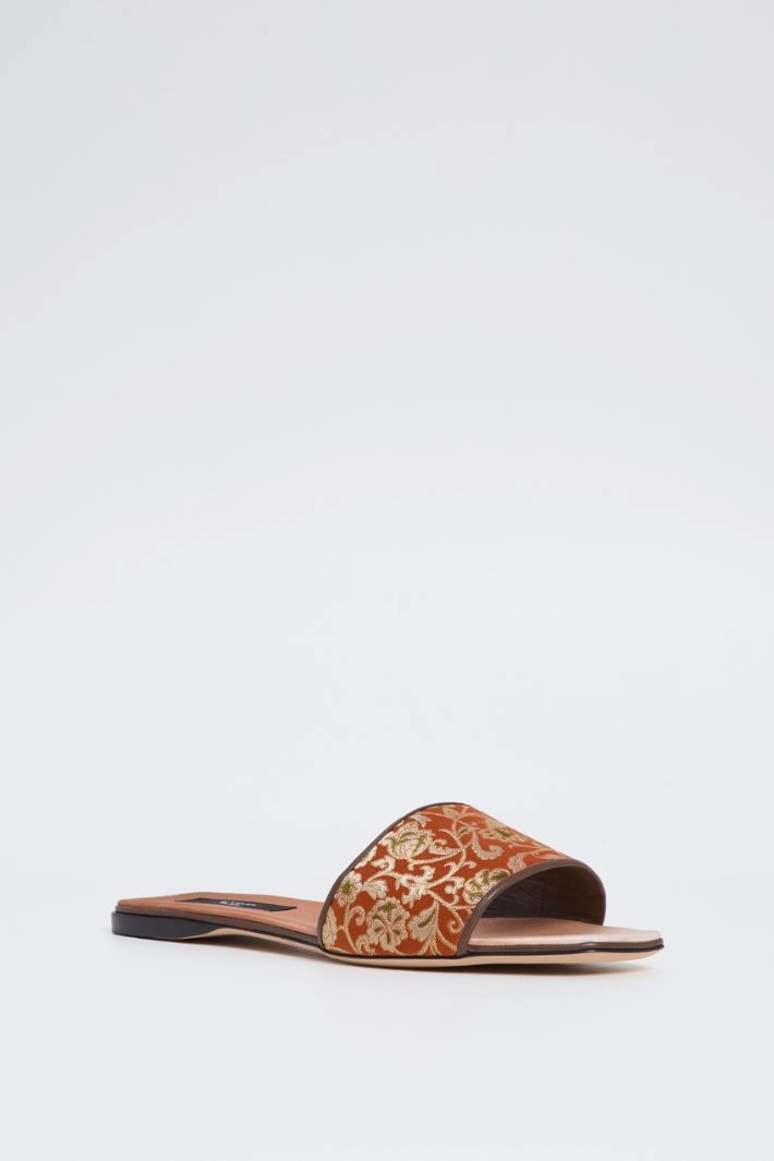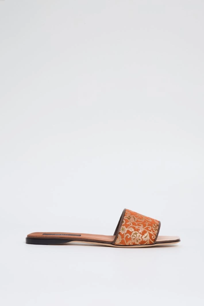 Upper in silk, cupro, metallised fiber; lining in calf; sole in leather.