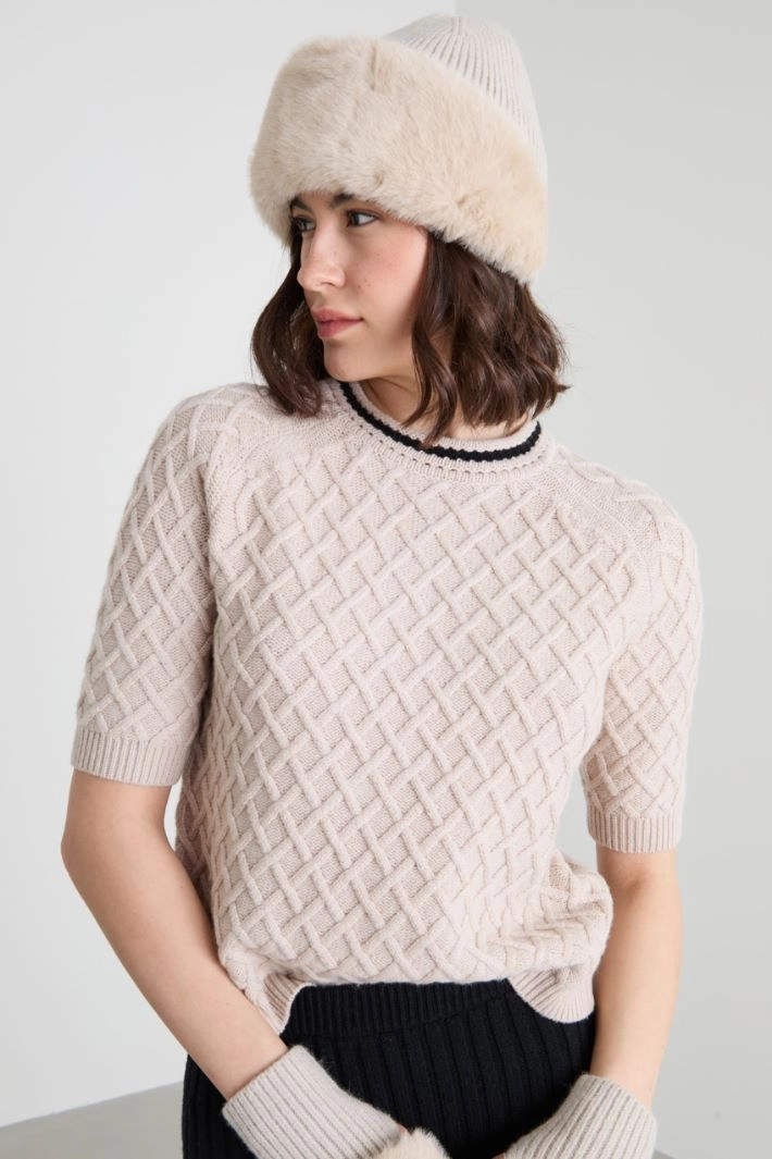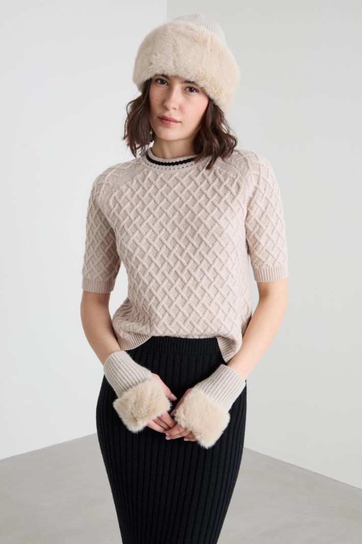 Knitted fabric 42% acrylic, 30% polyester, 28% polyamide; with details in 100% polyester.