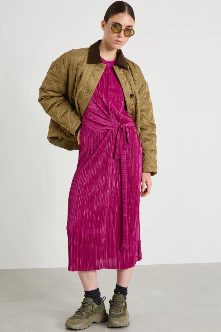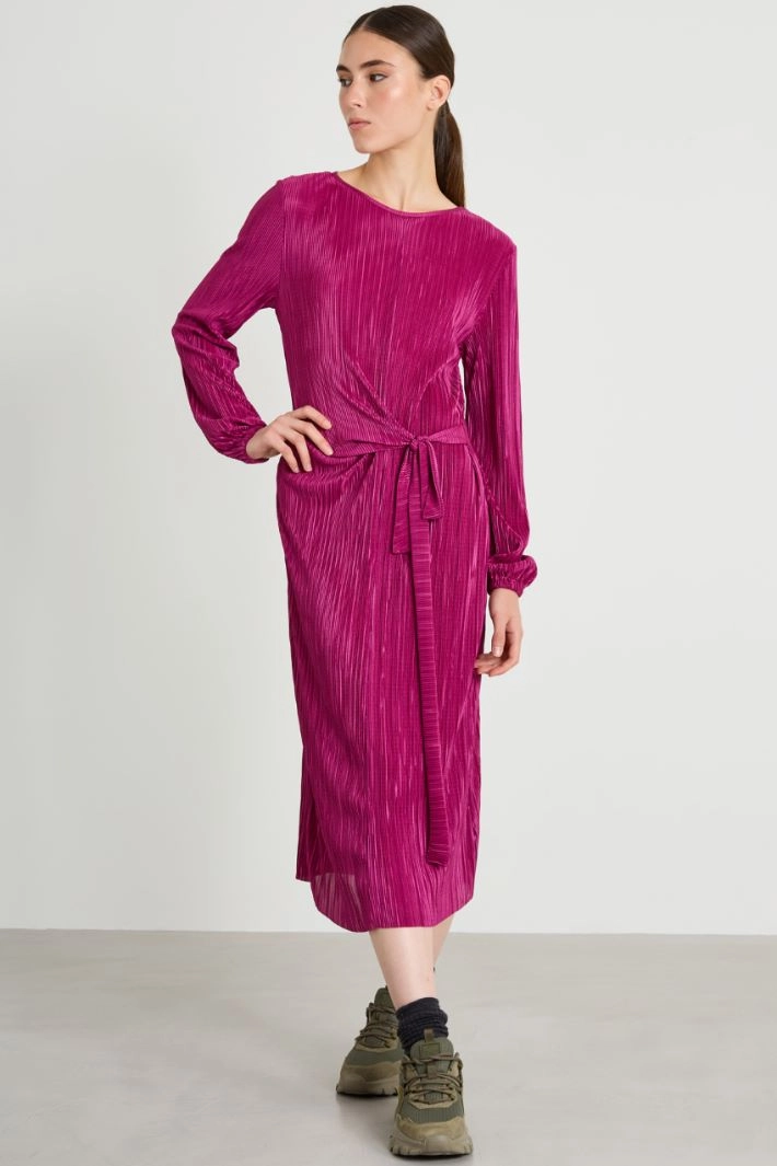 Midi flared dress in pleated jersey, with a round neckline and long sleeves with elastic at the wrist. Fastening at the waist with a belt.