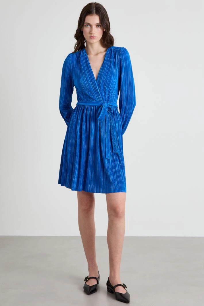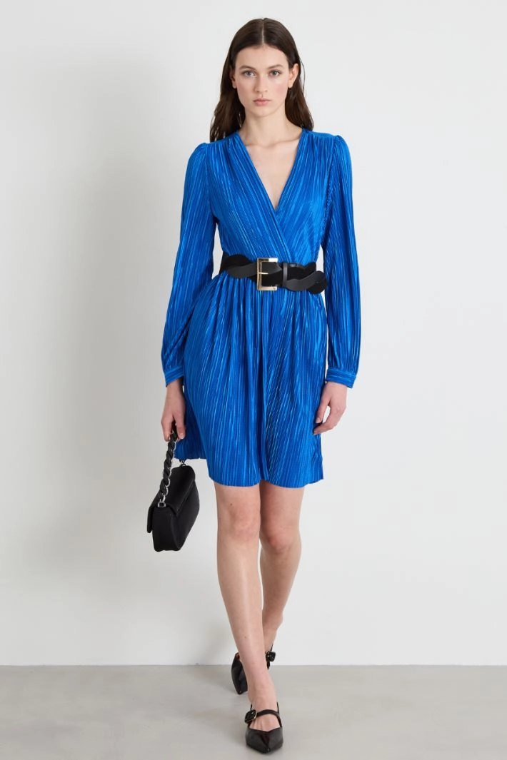 Fitted dress in pleated jersey, with crossed V-neck, long sleeves with cuff and button, elasticated waistband and matching belt.
