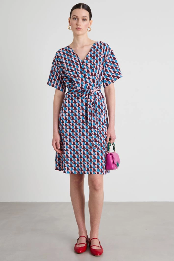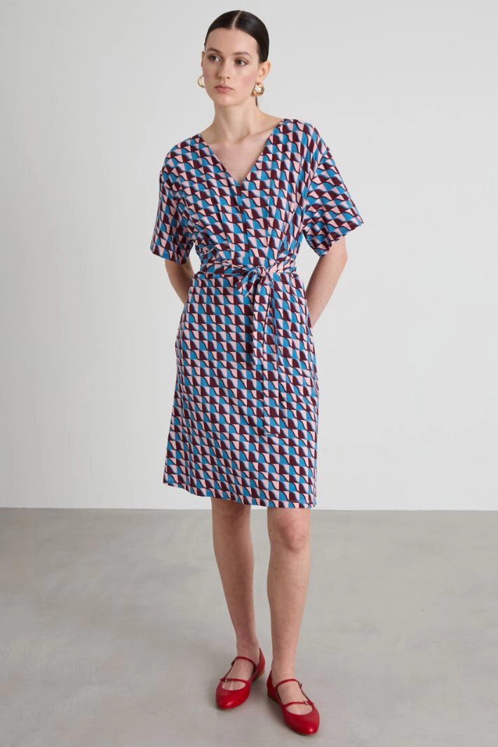 Slightly flared dress in stretch natural fibre jersey, with V-neck, short sleeves, inset pockets and matching belt.