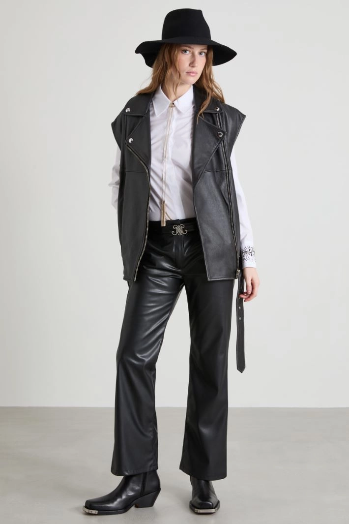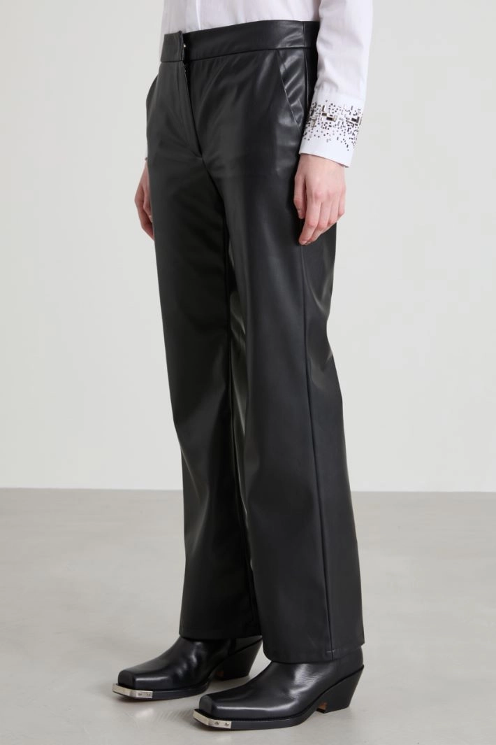Straight-cut trousers in faux leather, with French pockets on the front. Concealed fastening with zip, button and hook.