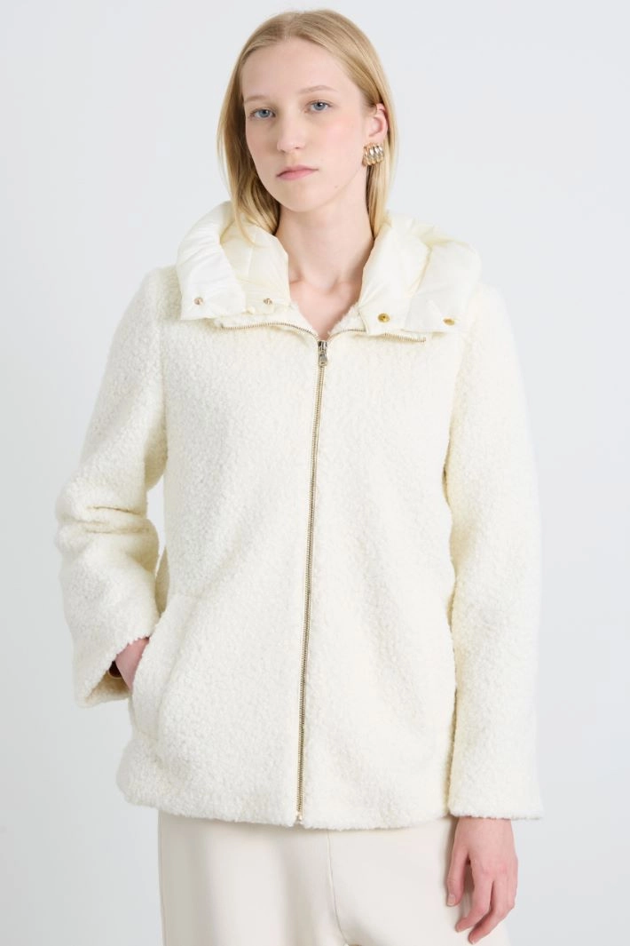 Padded, straight-fit jacket in bouclé jersey, with a high neck and removable hood, long sleeves and side welt pockets. Zip fastening
