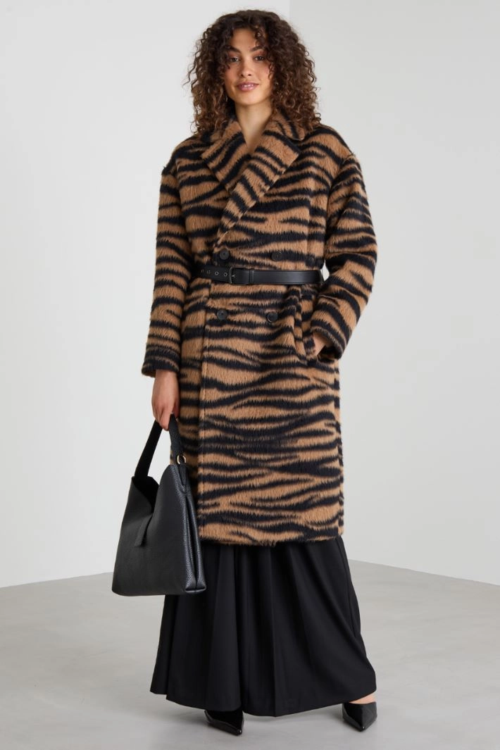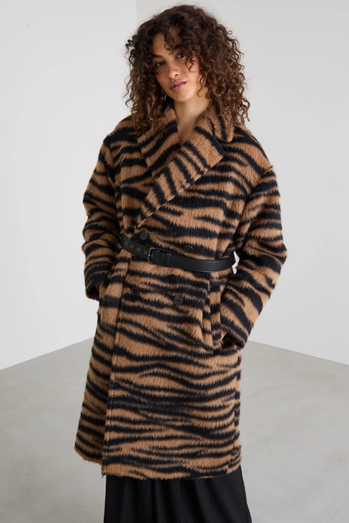 Straight-fit coat in jacquard wool and alpaca fur-effect fabric, with lapel collar, long sleeves, welt pockets and central vent on the back. Double-breasted fastening with buttons. Lined. Matching belt.